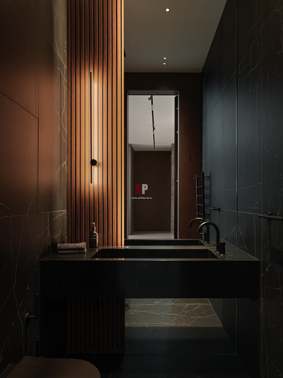 Гостевой санузел с брутальной атмосферой и темной палитрой.