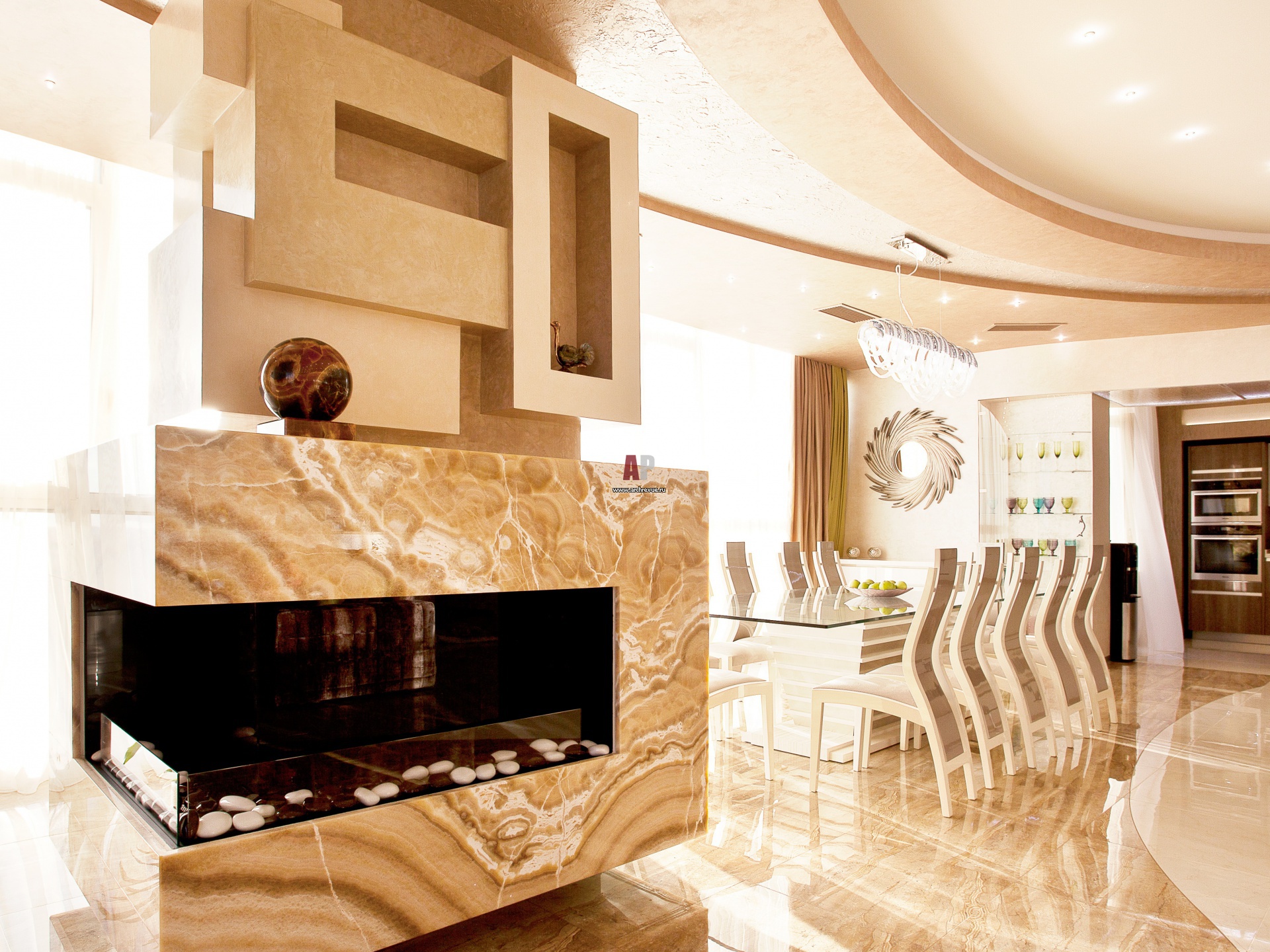 Главным элементом гостиной служит камин, облицованный ониксом. Обеденный стол, Mab Home Furniture (модель Style). Стулья, Gualtorres.