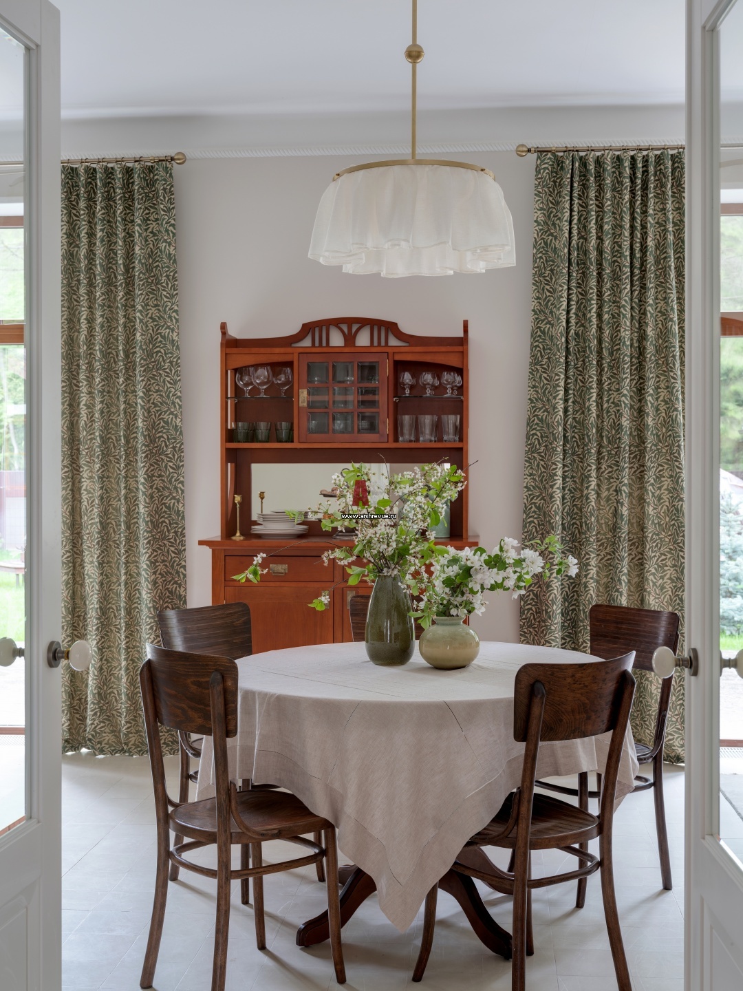 Столовая. Буфет изготовлен по бельгийскому антикварному прототипу. Стулья отреставрированные. Шторы сшиты из ткани, Morris & Co.