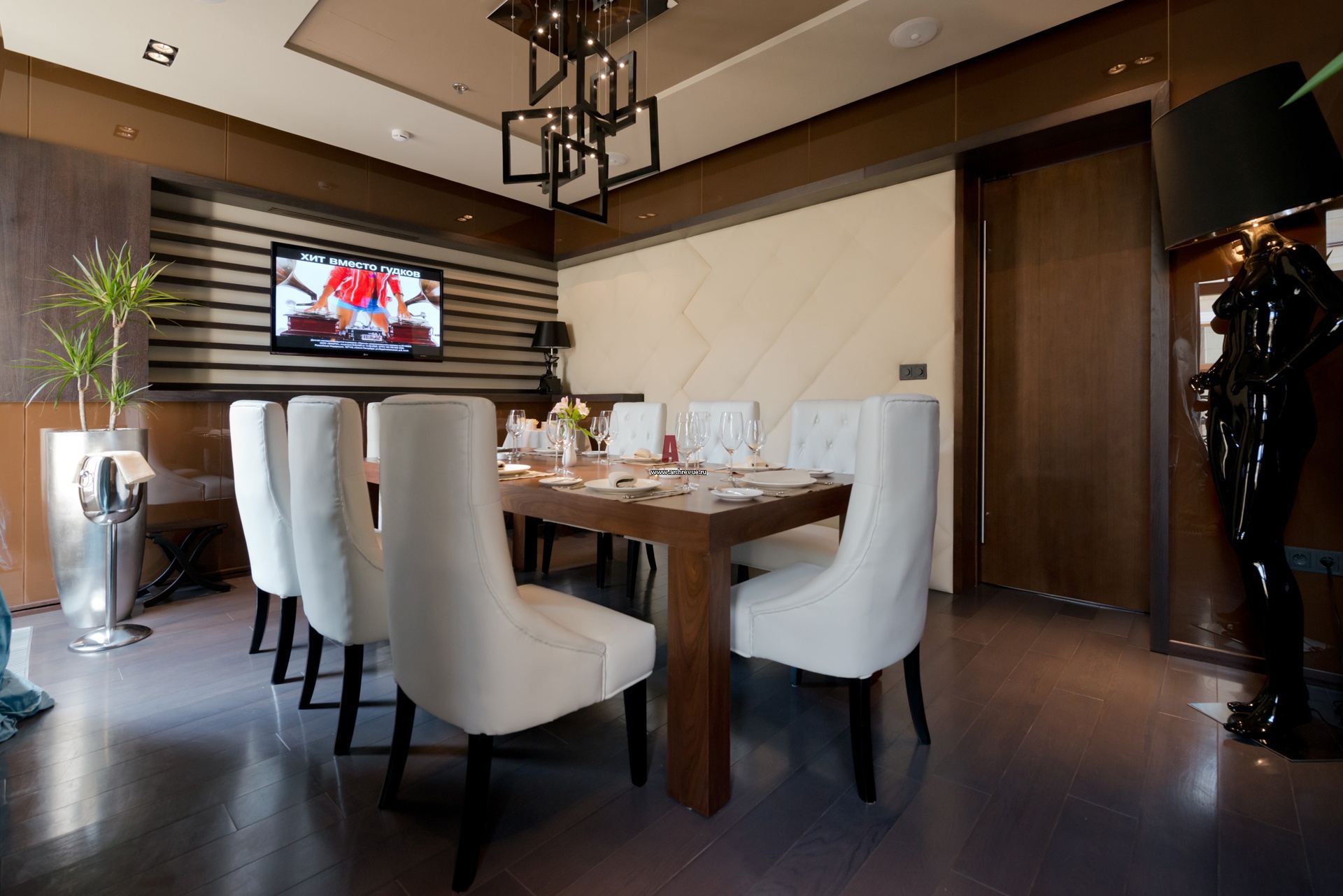 По периметру помещение VIP-зала отделано карнизом и панелями из глянцевого дерева. Центральная стена выполнена из белой кожи.