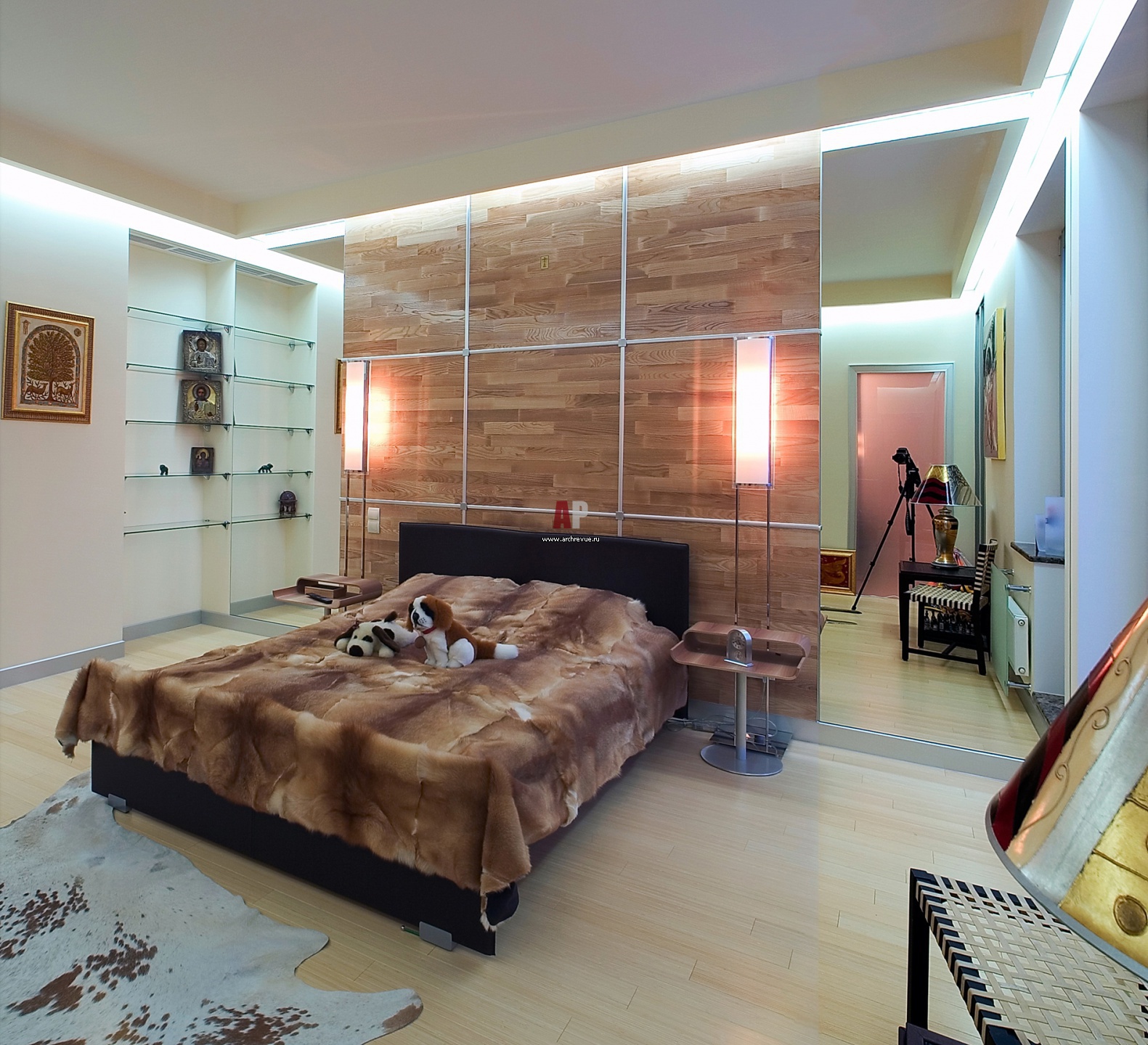 Меньшая квартира (площадью 100 кв. м) отдана под детскую зону (спальня, кабинет, ванная). Она расположена справа от прихожей.