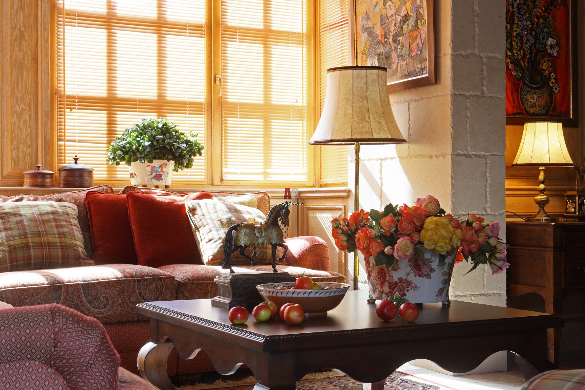 Интерьер гостиной дома выдержан в теплых песочных тонах с яркими акцентами. Шторы, Sanderson.