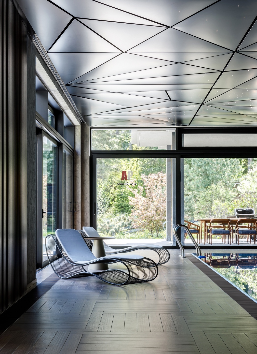 Бассейн 3,5 х 11 метров с панорамными раздвижными окнами и видом на участок. Стены отделаны декоративной краской и рейками из ореха. Потолок выполнен из металлических ассиметричных панелей. Шезлонги и столик у бассейна, Cattelan Italia.