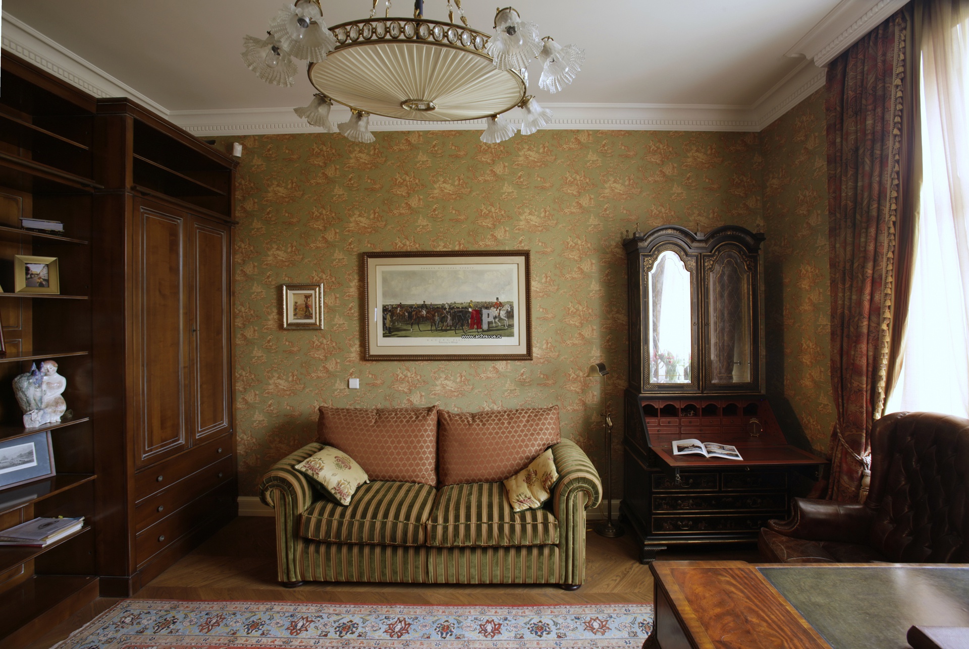 Английский кабинет. Бюро в готическом стиле, антиквариат. На зеленых обоях – изображения сцен охоты. Гравюры и акварели с батальной тематикой.