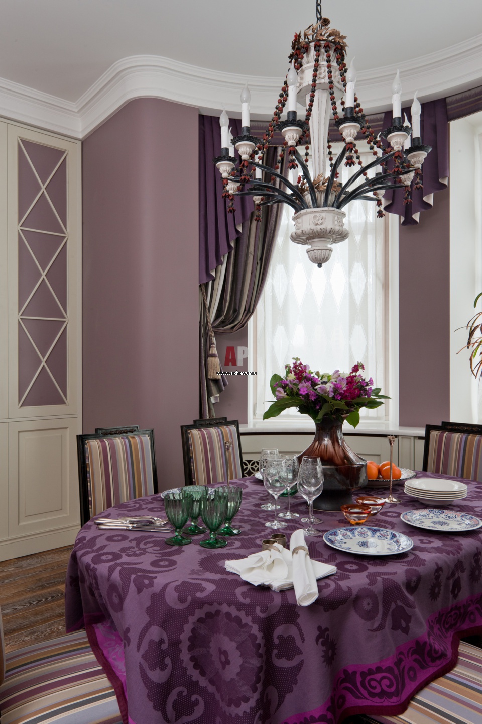 Зона столовой в полукруглом эркере. Полосатая обивка мебели сочетается с цветом стен и вместе с драпировками освежает комнату. Светильник, Chelini. Гипсовая лепнина, «Петергоф».