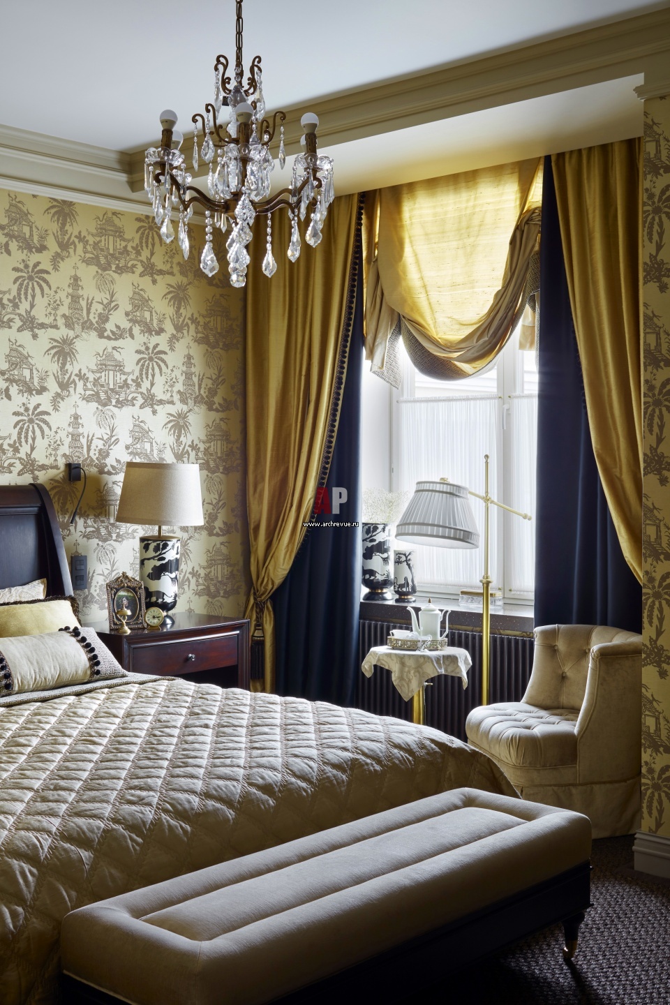 Спальня расположена не на солнечной стороне, и ее единственное окно сильно утоплено в стену. Это подтолкнуло дизайнера к использованию темной цветовой гамме и тактильных материалов, чтоб создать уютное затемненное помещение. Настольные лампы с керамическим основанием и вазы, Asiatides.