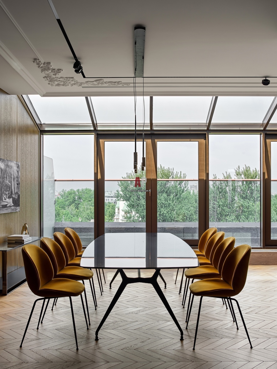 Столовая. Обеденный стол, Rimadesio. Стулья, Gubi. Латунный подвес, Estiluz.