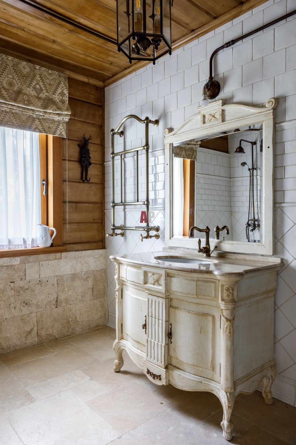 Белый санузел при гостевой спальне. Умывальник с историческим декором. Столешница выполнена из мрамора.