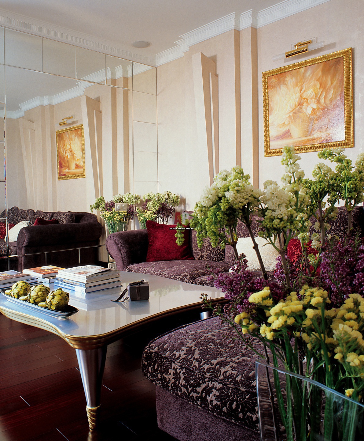 Интерьер гостиной в лавандовых тонах. Ощущение легкости и воздушности создают зеркала на стенах и лакированная мебель в стиле ар-деко. Зеркальные панели использованы с фацетами. Обивка дивана сиренево-лавандового цвета.