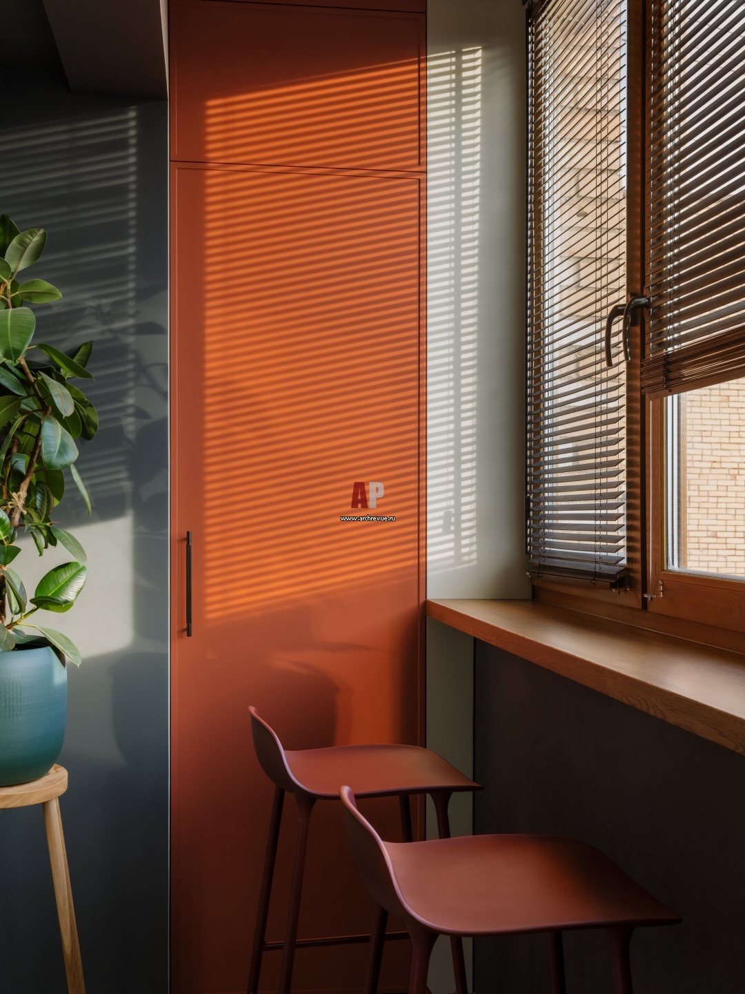 Барная зона на лоджии. Широкий подоконник из шпона ореха. Барные стулья, Normann Copenhagen, модель Form.
