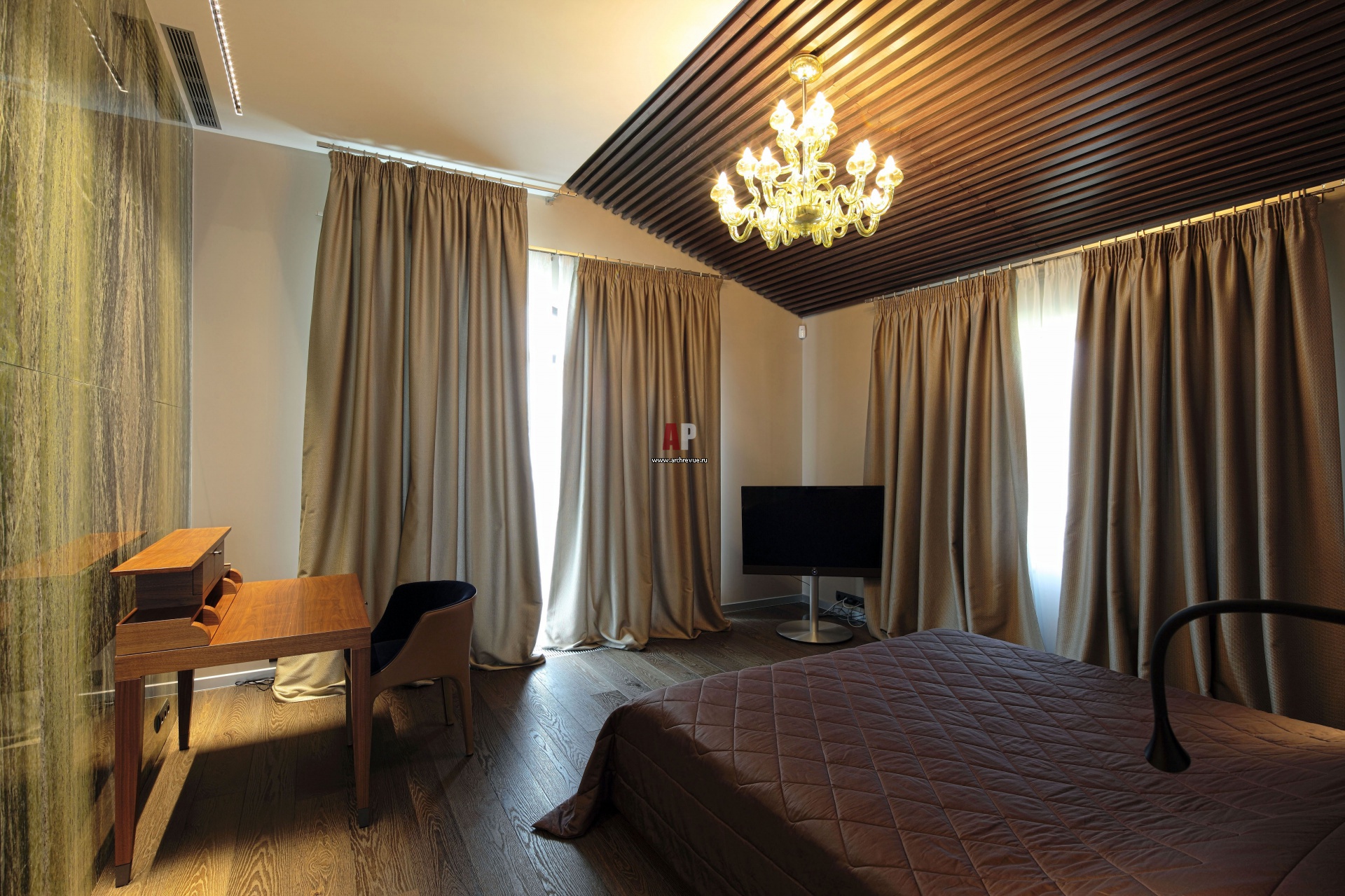 Скос потолка в хозяйской спальне оформлен деревянными рейками.