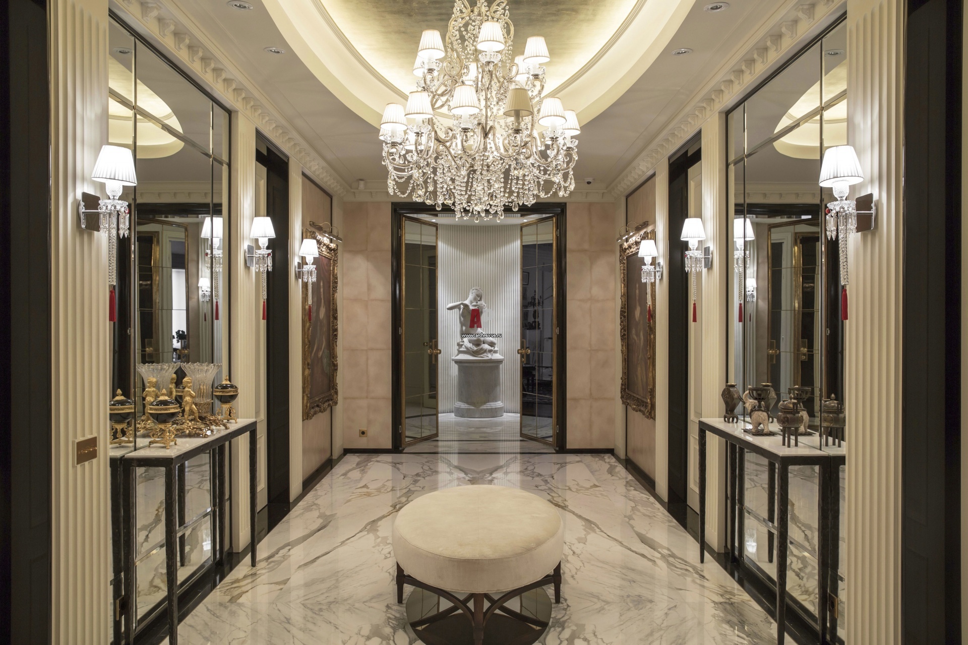 Холл выглядит парадно благодаря осевой планировке, симметрии и отделке из натурального камня и зеркальных панно с фацетами. Консоли, Christian Liaigre. Пуф, Baker. Люстра, Ralph Lauren. Бра, Baccarat.