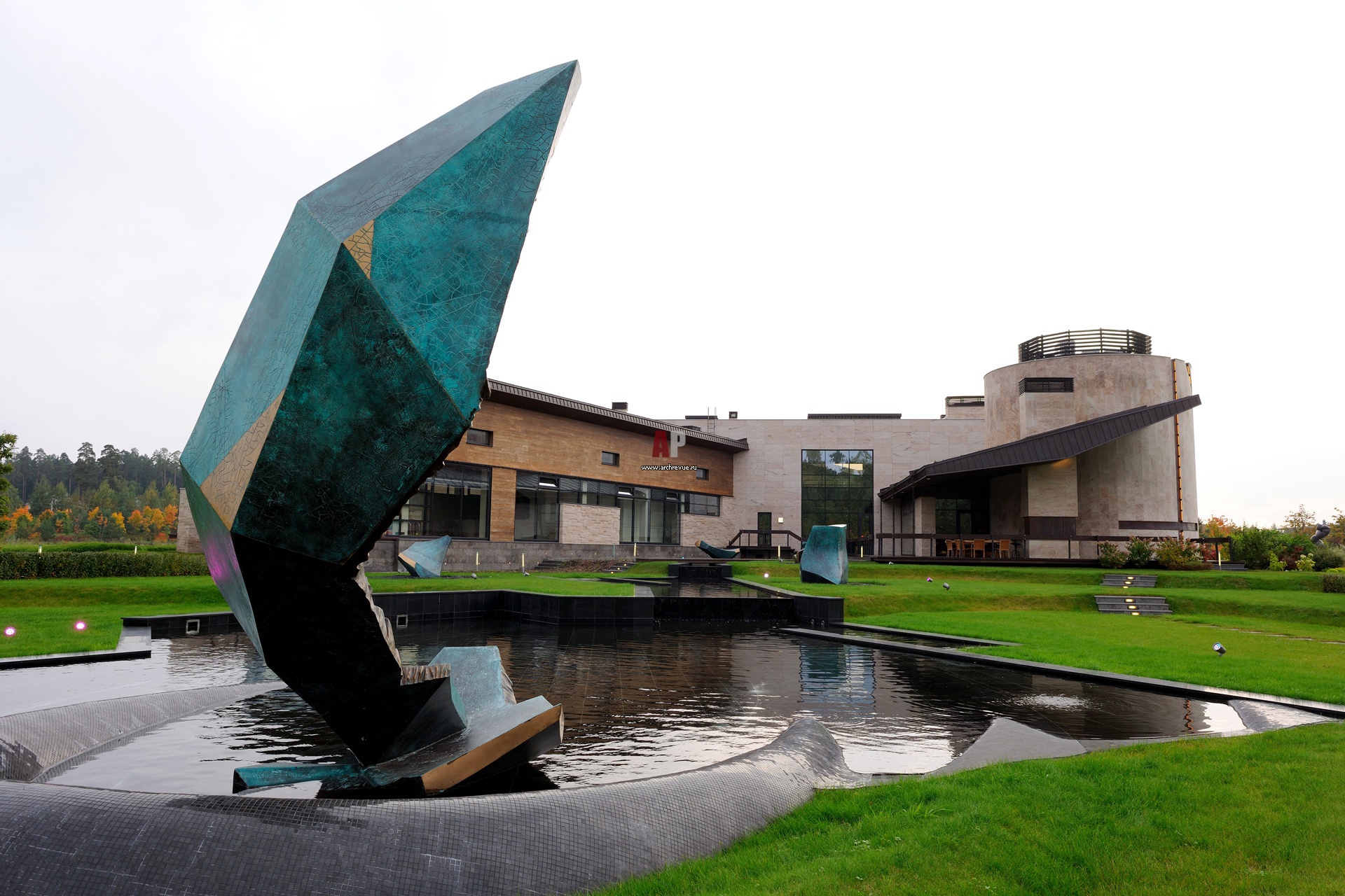 Главный фасад акцентирован скульптурной композицией «Метеорит» Михаила Ревы. Самый крупный элемент их бронзы помещен на берегу пруда. Он подчеркивает эклектичную архитектуру дома. Остальные обломки метеорита разбросаны по ландшафту.