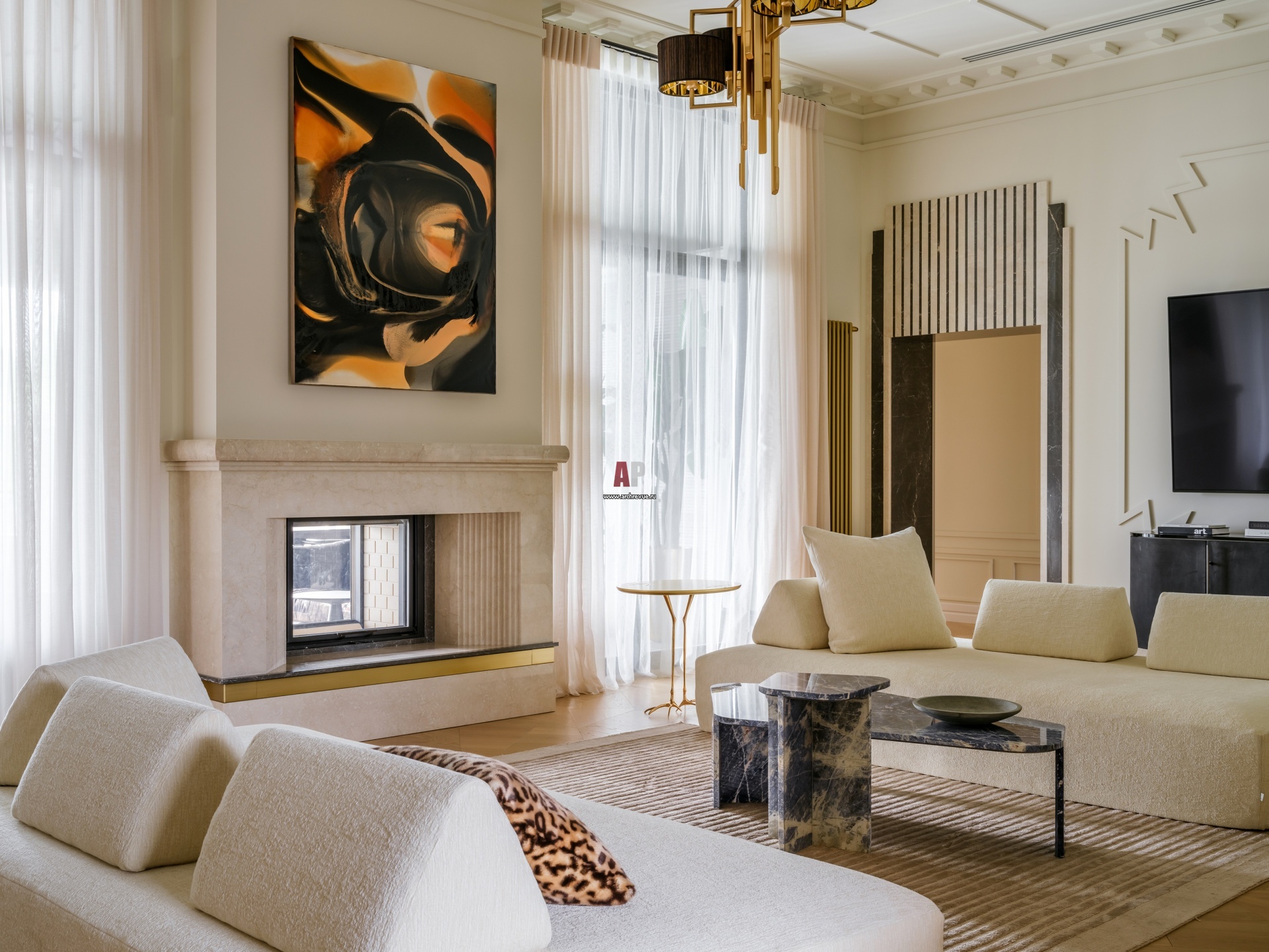 Гостиная с двусторонним камином. Портал оформлен светлым мрамором, в цвет стен. Люстра, Sigma L2. Комод, Baxter.