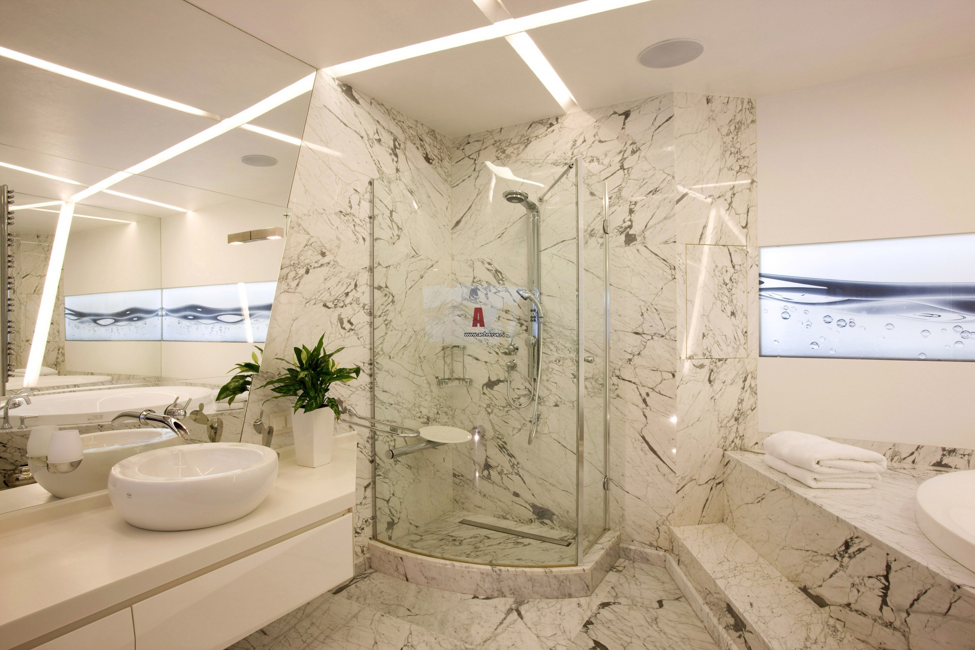 Фото душевой кабины в интерьере хозяйской ванной комнаты. Сантехника, Laufen, Geberit; смесители, Dornbracht, Hansgrohe.