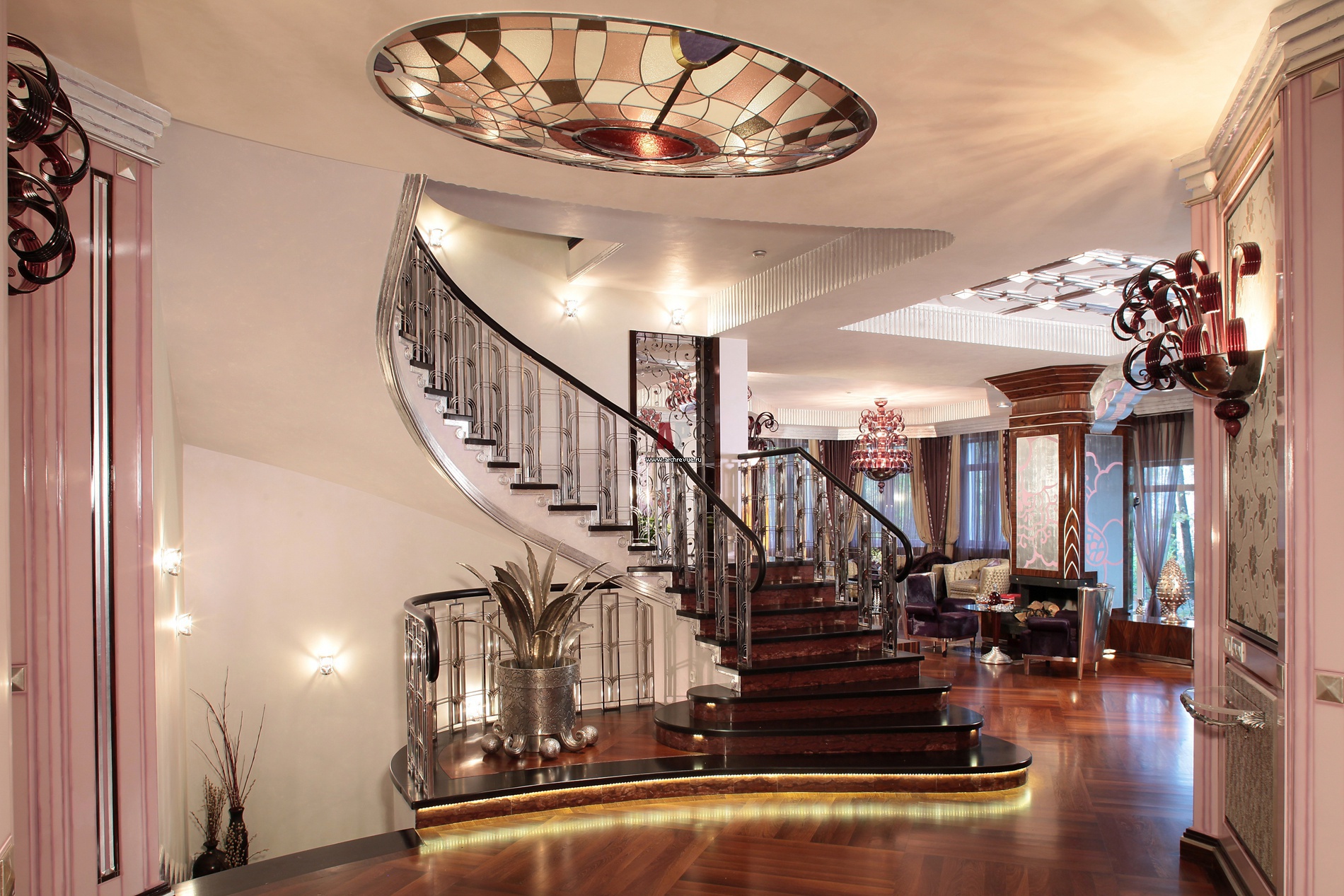Украшение лестничного холла – роскошная лестница в стиле ар-деко. Она выполнена по эскизам архитектора. Декоративное алое, Athena.