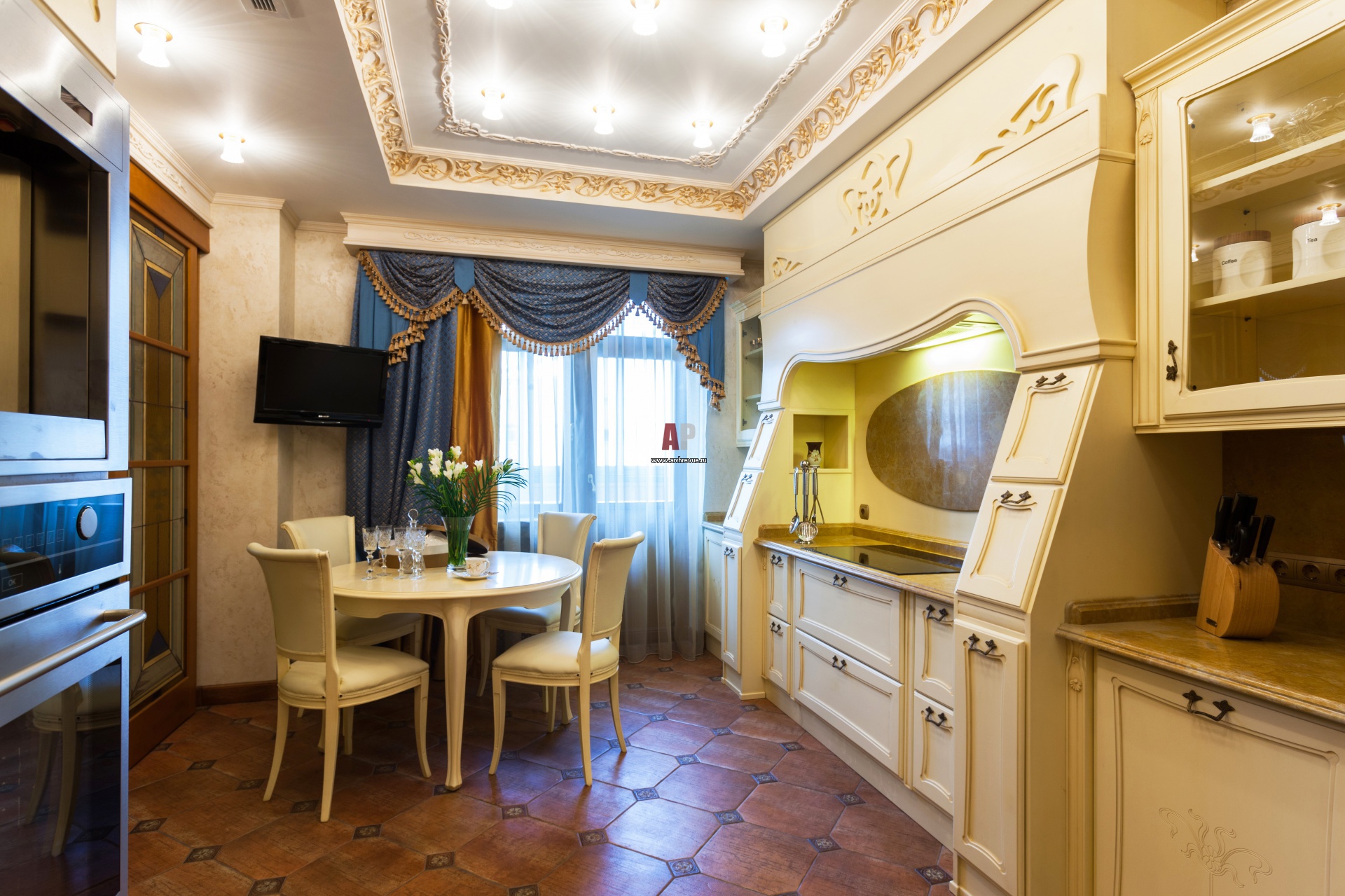 Фото интерьера кухни в стиле ар-нуво. Потолочный фриз с витиеватым цветочным декором украшен состаренным золотом.