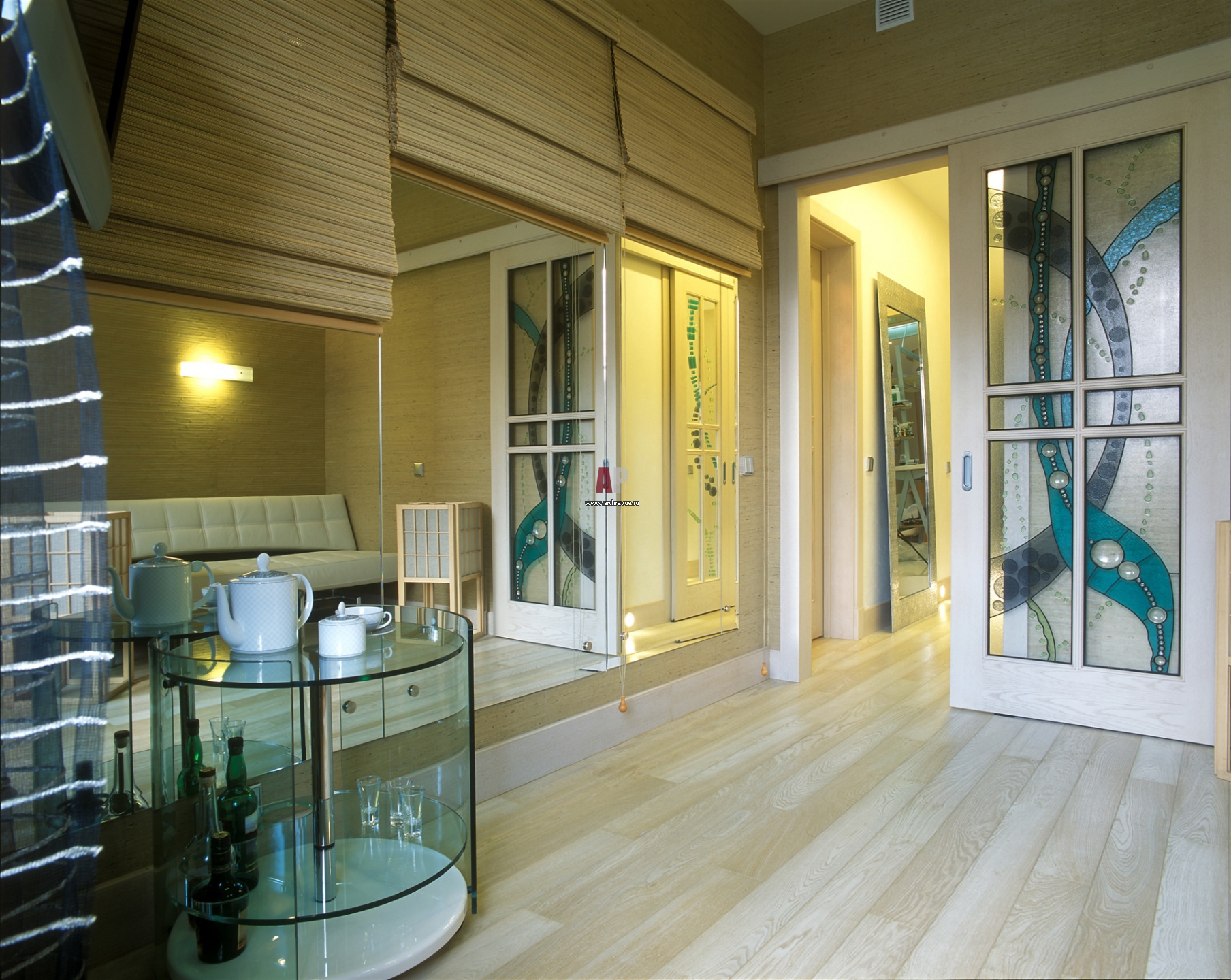 Зеркала в гостиной зрительно расширяют помещение. На полу – массивная доска из выбеленного дуба, «Мир Паркета».