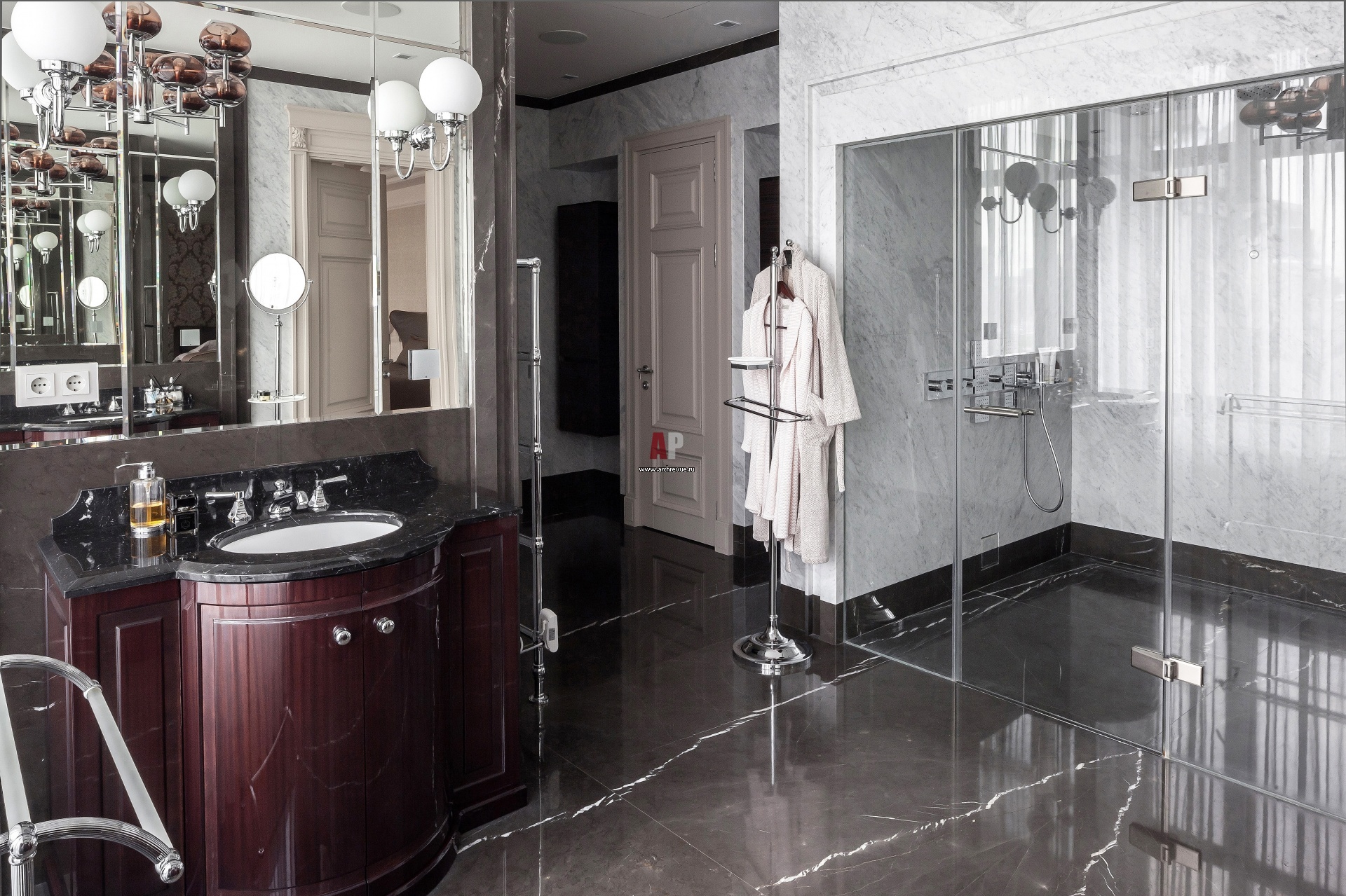 Хозяйская ванная комната выдержана в стиле неоклассика. Стены и полы облицованы мрамором Bianco Carrara. Ванна, мебель для ванной комнаты, Devon & Devon.