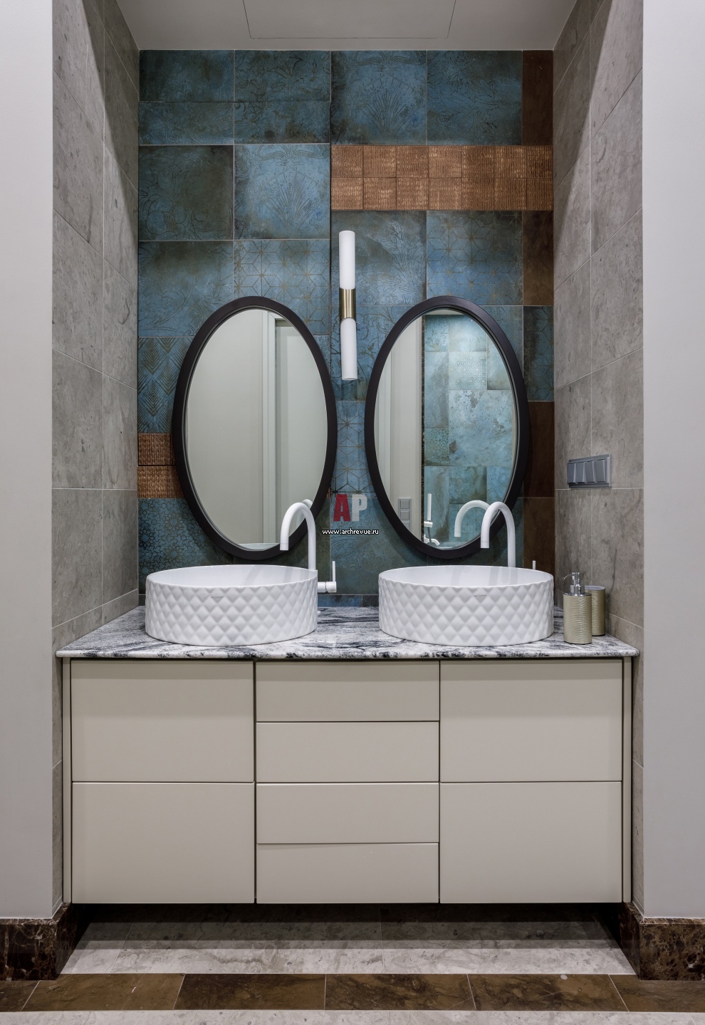 Стены за умывальником в детском санузле оформлена плиткой бирюзового цвета со вставками цвета латуни. Раковины, ArtCeram. Смесители, Tres.