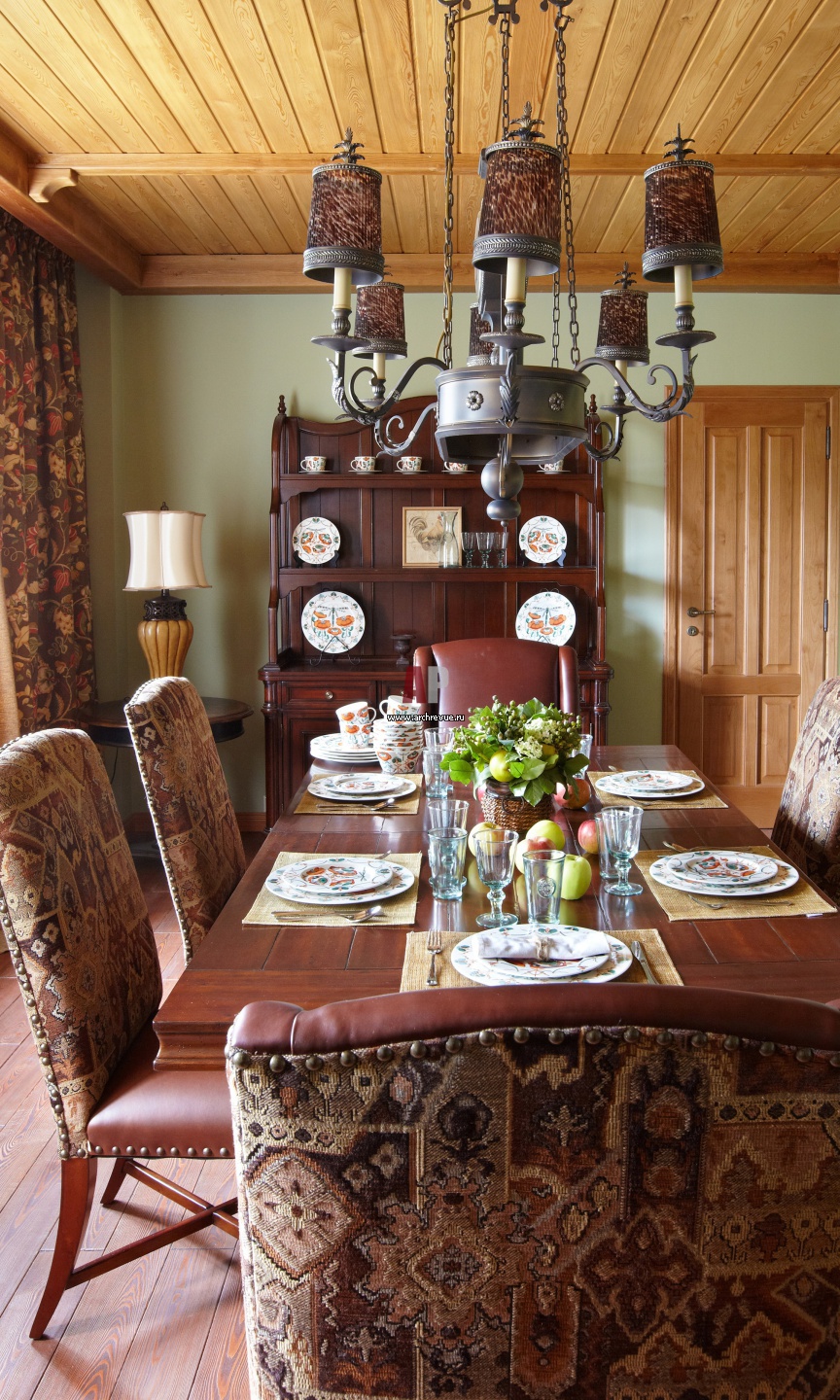 Парадная столовая зона решена в едином пространстве с гостиной. На фоне стен табачного цвета и потолков, зашитых брашированной лиственницей, выгодно сморятся массивные стулья из кожи с гобеленовыми спинками, Fine Furniture Design.