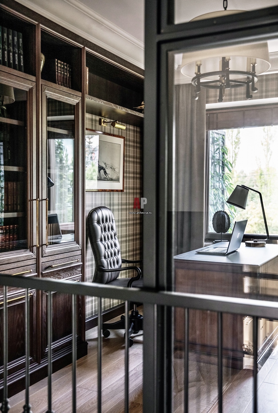 Многоуровневый таунхаус в классическом стиле. Мужской кабинет расположен на пол лестничного пролета выше столовой. Благодаря стеклянным раздвижным дверям он воспринимается частью общественного пространства. Письменный стол, Mastri Italiani. Кресло, Mascheroni. Шкаф сделан на заказ. Светильник, Visual Comfort & Co.