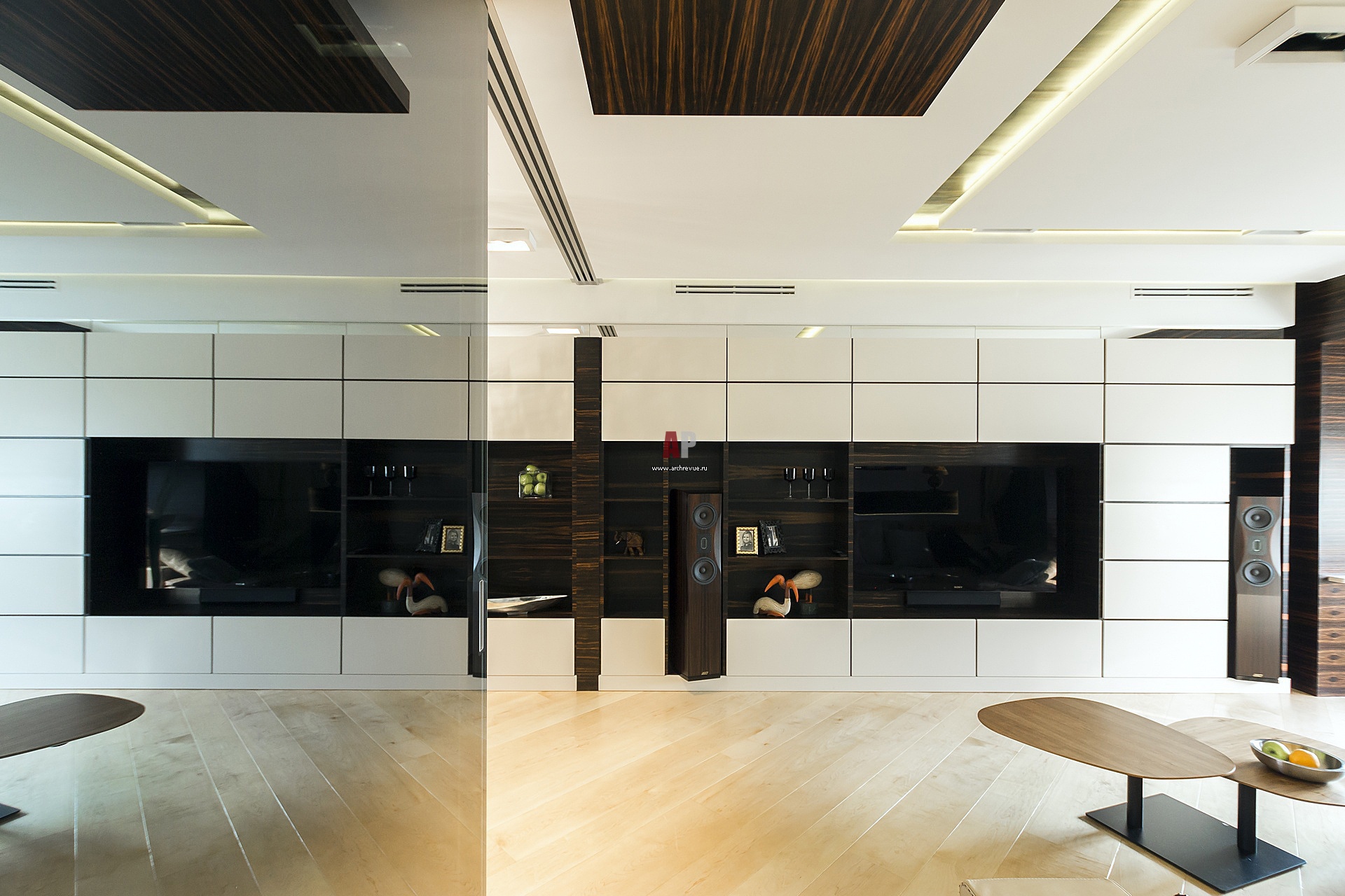 Фото интерьера гостиной в стиле минимализм. Одну из стен гостиной полностью занимает встроенный шкаф, в него встроен домашний кинотеатр и сложная стереосистема.