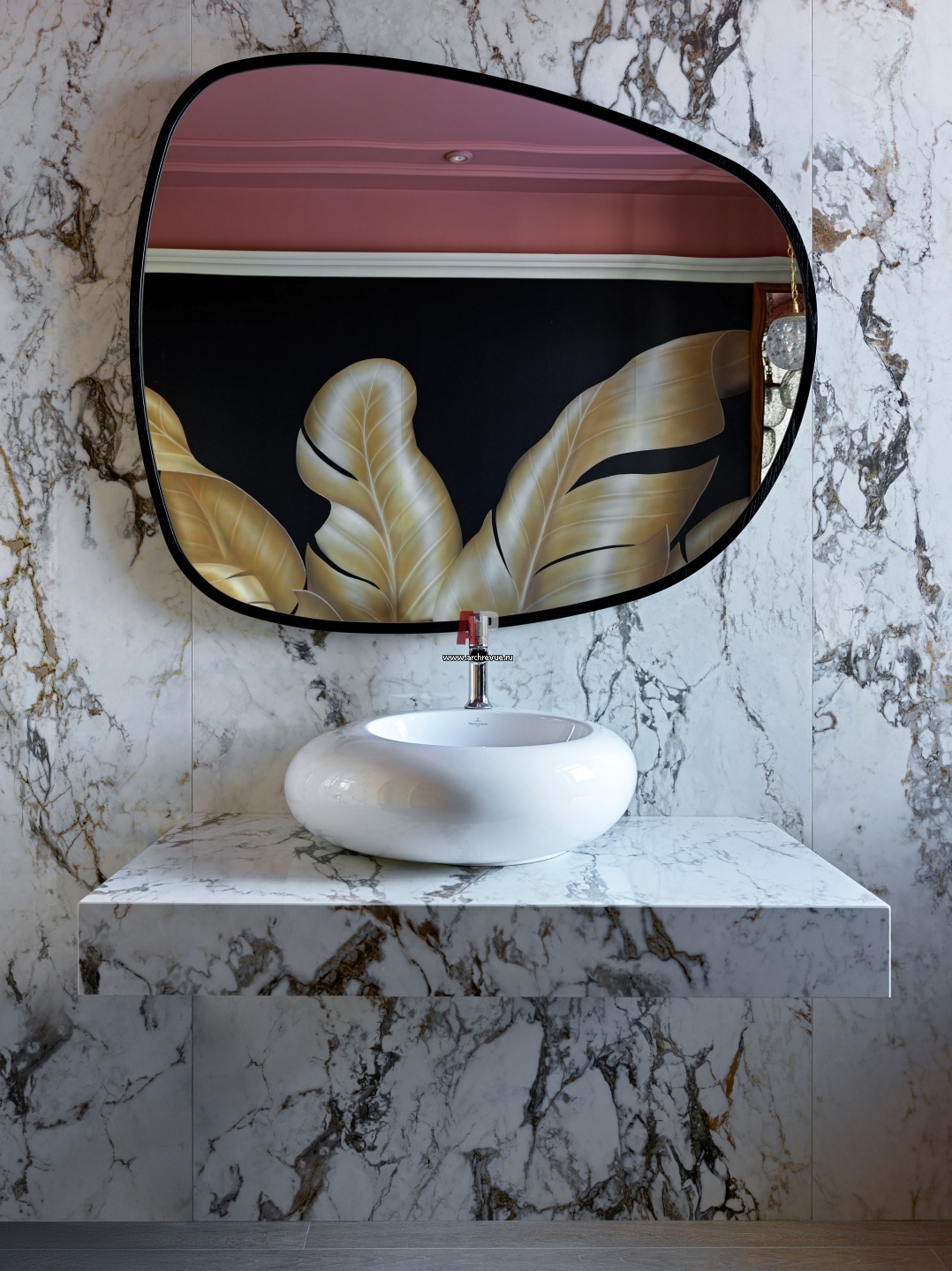 Санузел оформлен керамогранитом под мрамор. Раковина, Villeroy & Boch. Ассиметричное зеркало, Furman.