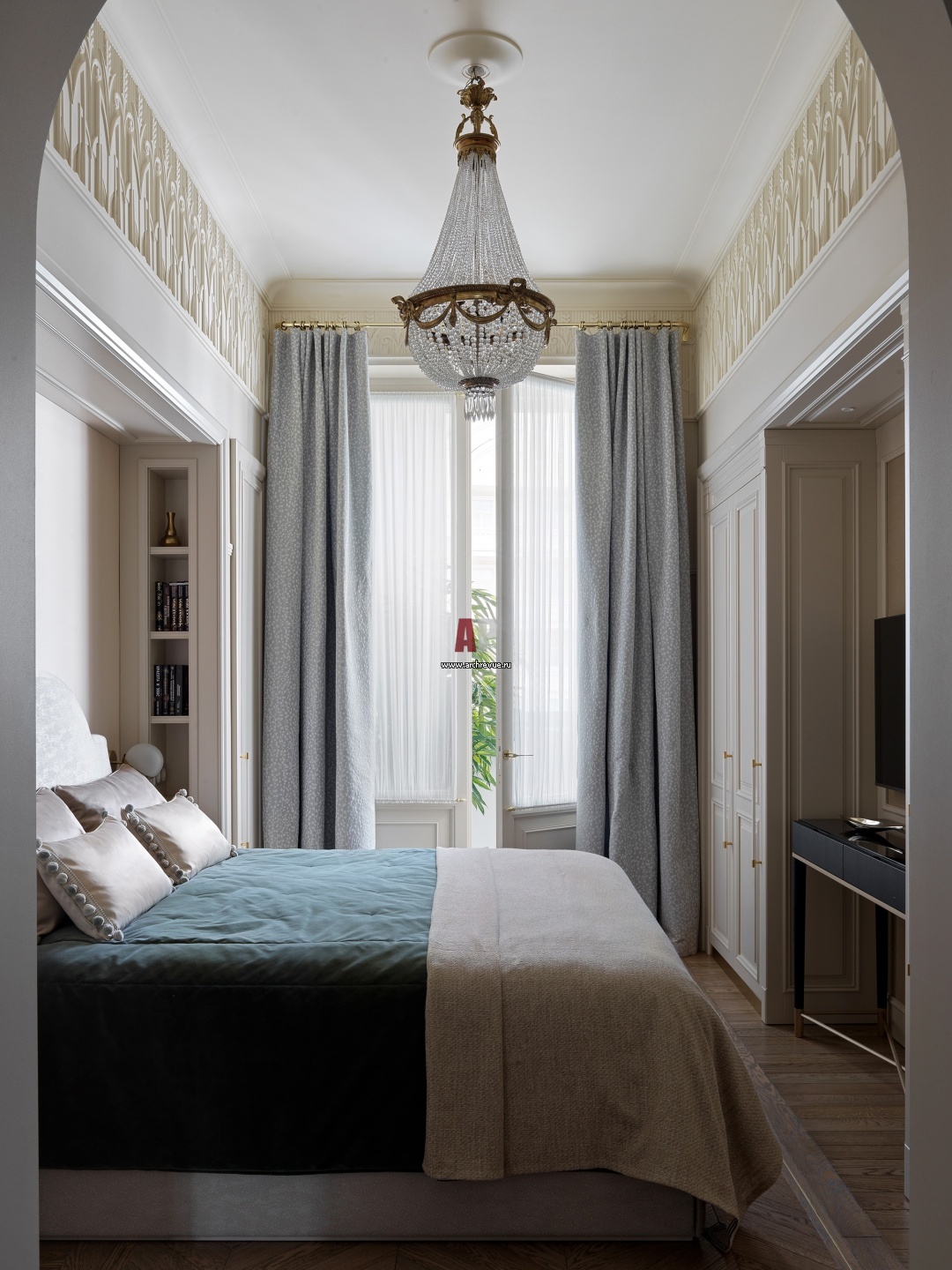 Спальня хозяйки. Кровать, встроенные шкафы, на заказ, по эскизам дизайнеров. Люстра, антикварная, Франция, начало XX века.