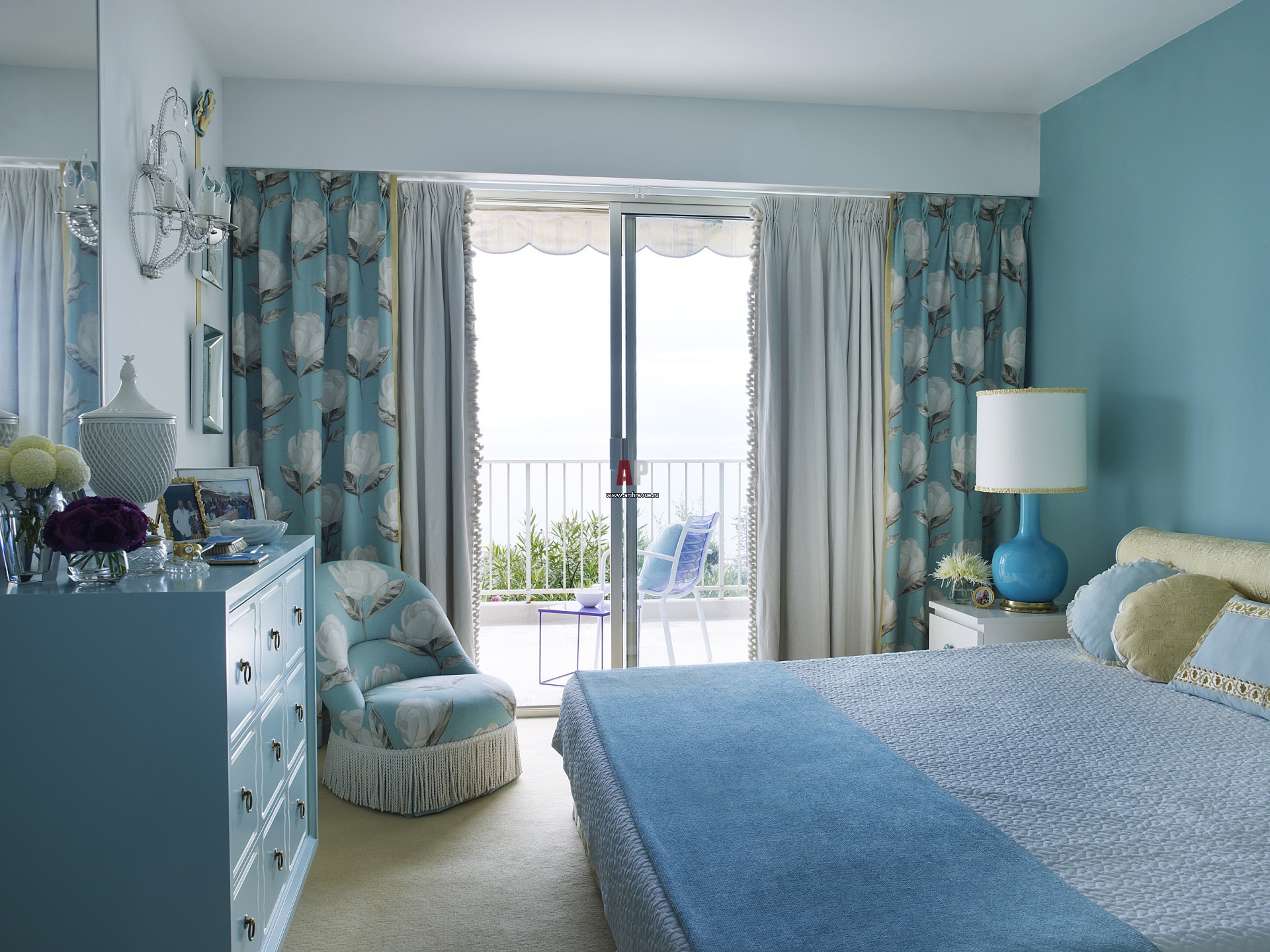 Хозяйская спальня цвета голубого неба. На ее дизайн вдохновила ткань от Osborne&Little с рисунком в виде крупных цветов белой магнолии. Из нее выполнены шторы и обивка винтажного кресла. Стены и комод выкрашены в сходный оттенок.