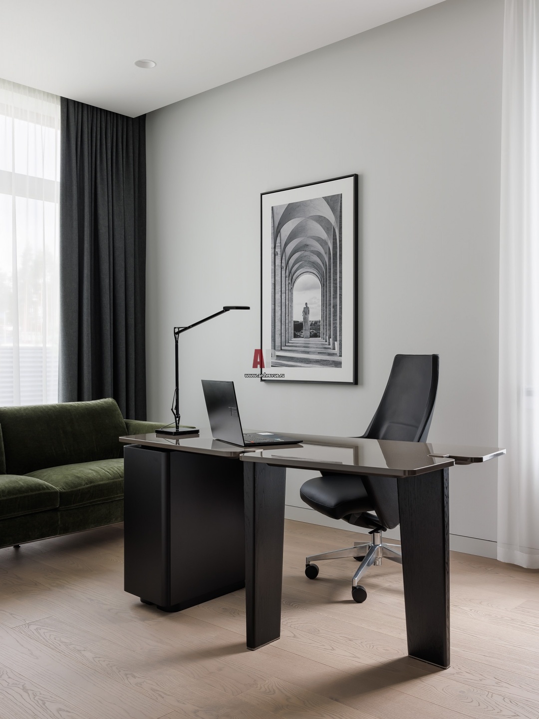 Кабинет на первом этаже. Стол рабочий, Minotti. Диван, Felis. Настольная лампа, Flos.