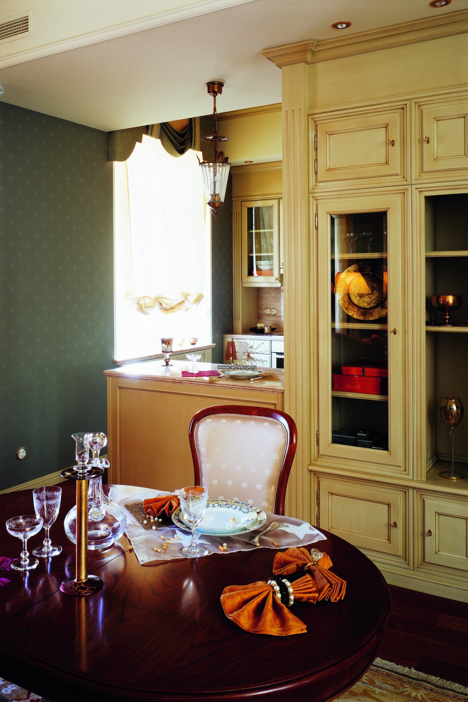 Вид из столовой на кухню. Две разные по назначению зоны разделяет барная стойка из светлого дерева, решенная в классике.