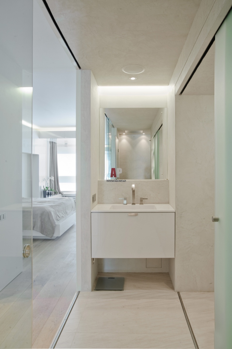 Санузел при спальне изолирован стеклянными раздвижными перегородками. Пол и стены облицованы плитами из известняка.