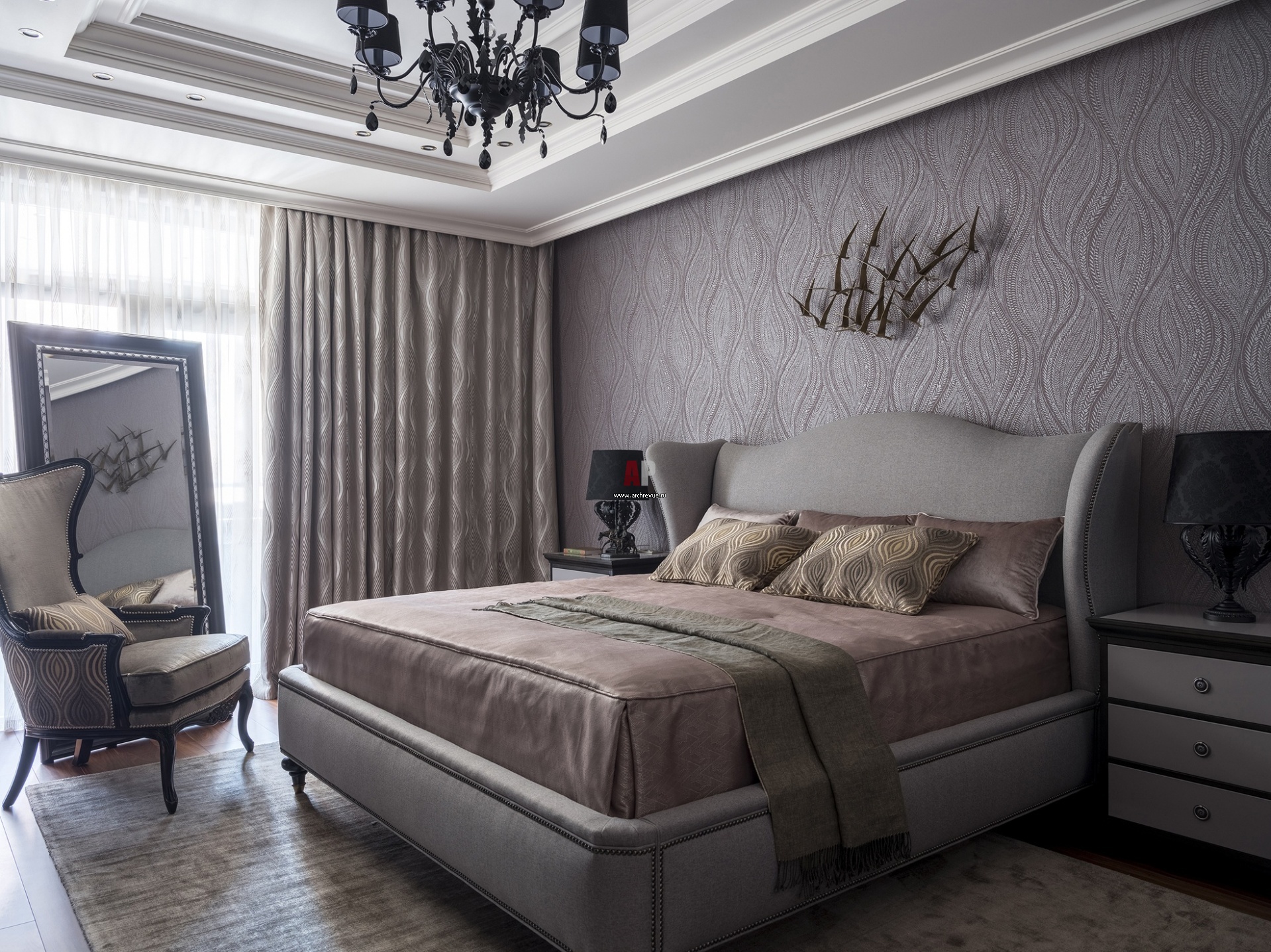 Мужская квартира в стиле ар-деко. Интерьер спальни. Кровать, Hickory White. Кресло, Paul Robert. Настенное панно из металла «Чайки», Artisan House.