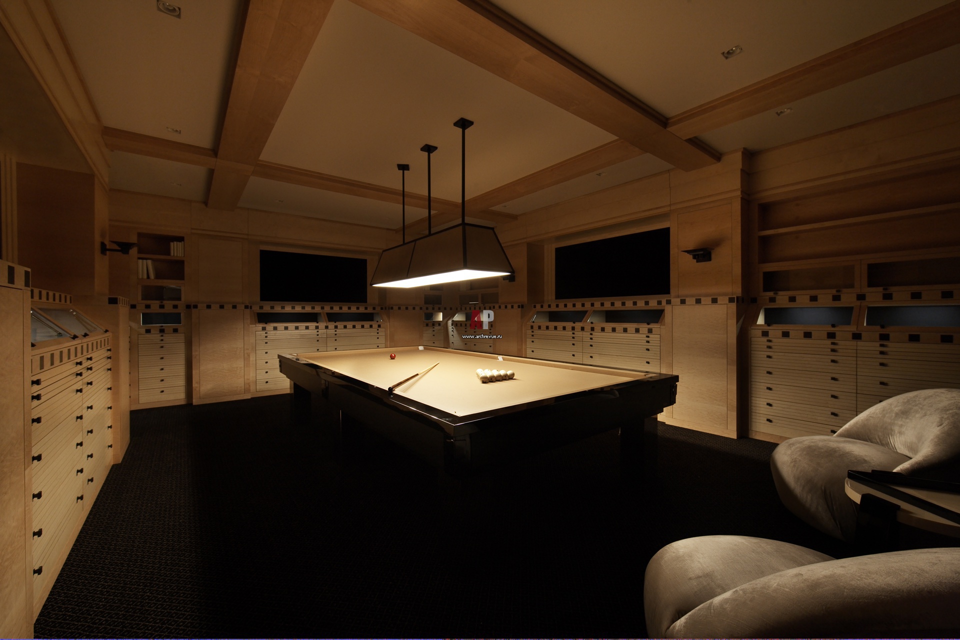 Стены бильярдной зашиты панелями из клена. Бильярдный стол, Ursus Biliardi.
