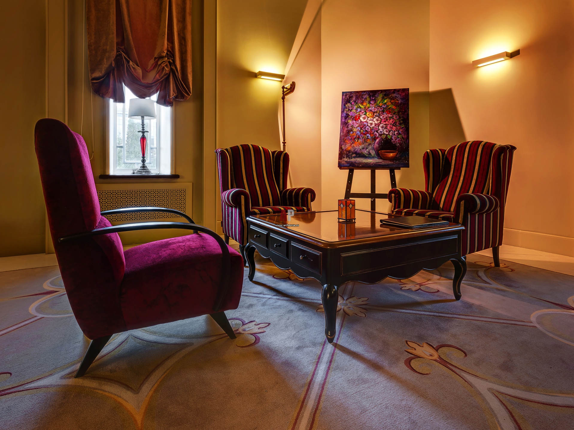 Зона отдыха для топ-менеджеров компании. Обивка кресел в красно-сиреневой гамме.