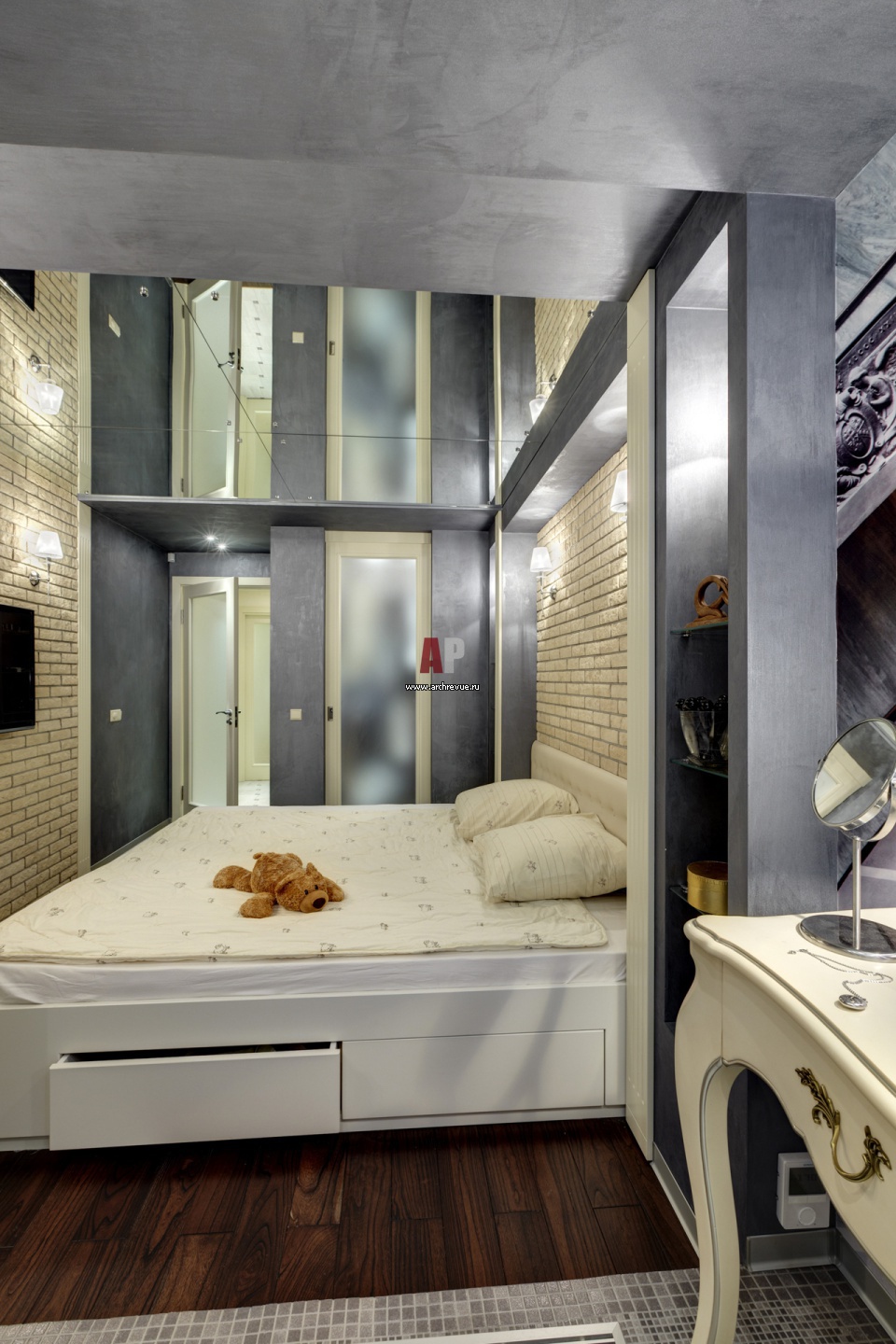 Интерьер спальни. Серой краской с фактурой бетона выделены ниши и проходные зоны, а также гипсокартонные элементы потолка.