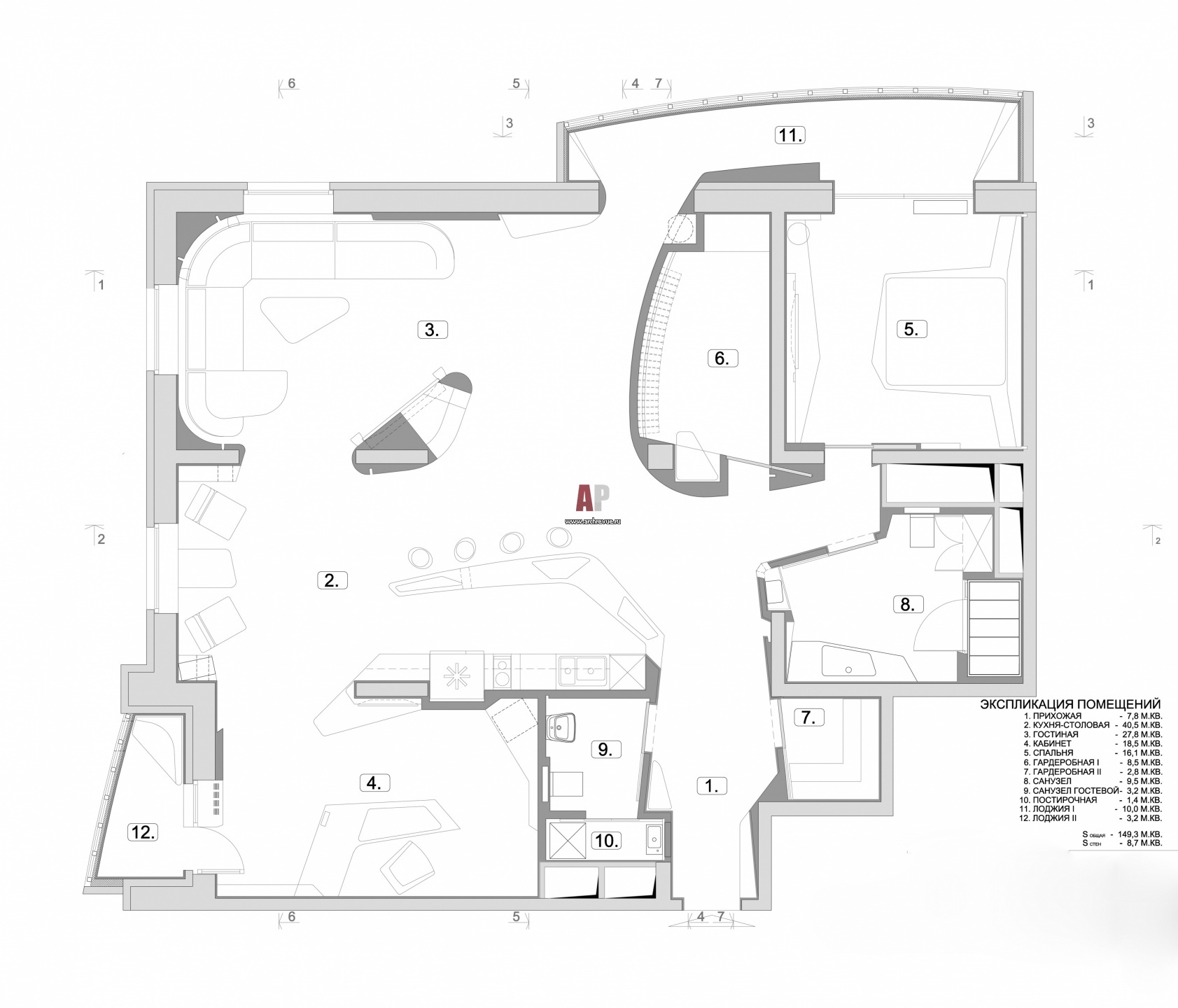 Планировка квартиры с общей гостиной с биоморфными формами.