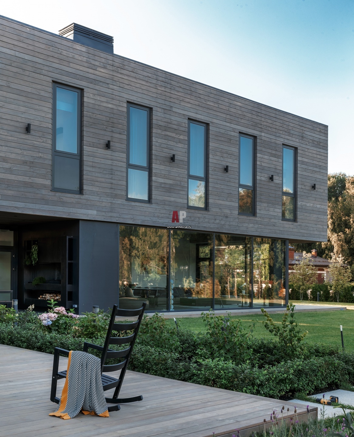 Двухэтажный дом с панорамным остеклением первого этажа. Объем второго этажа нависает над первым и защищает его от непогоды и прямых солнечных лучей. Фасад второго этажа зашит лиственницей, она оттонирована в сизо-серый цвет и покрыта маслом, которое обнажает структуру дерева.