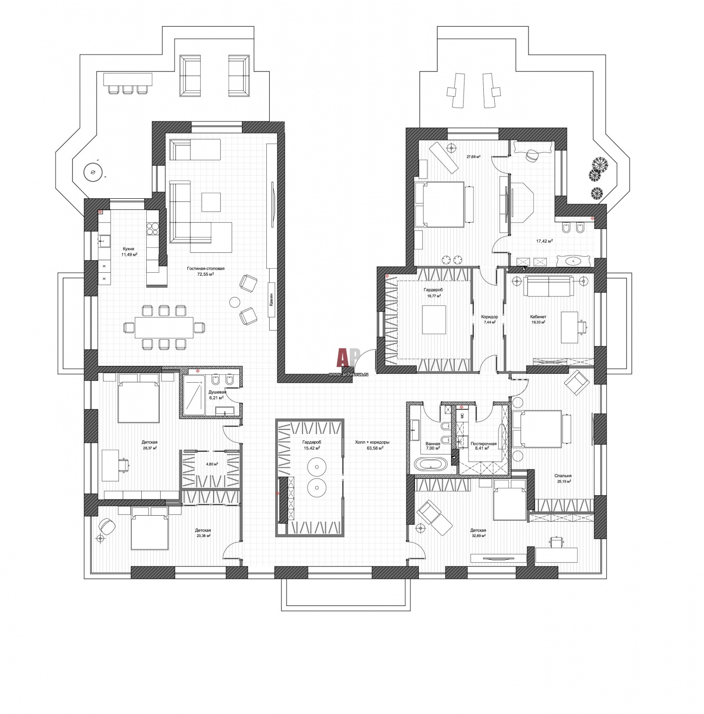 План семейного пентхауса в центре Новосибирска. Общая площадь - 350 кв. м.