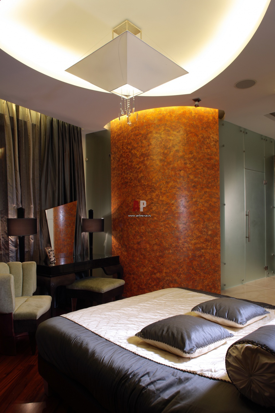 Фрагмент спальни. Перегородки и дверь выполнены из матового стекла. Полукруглый элемент декорирован фактурной штукатуркой с эффектом ржавого металла.
