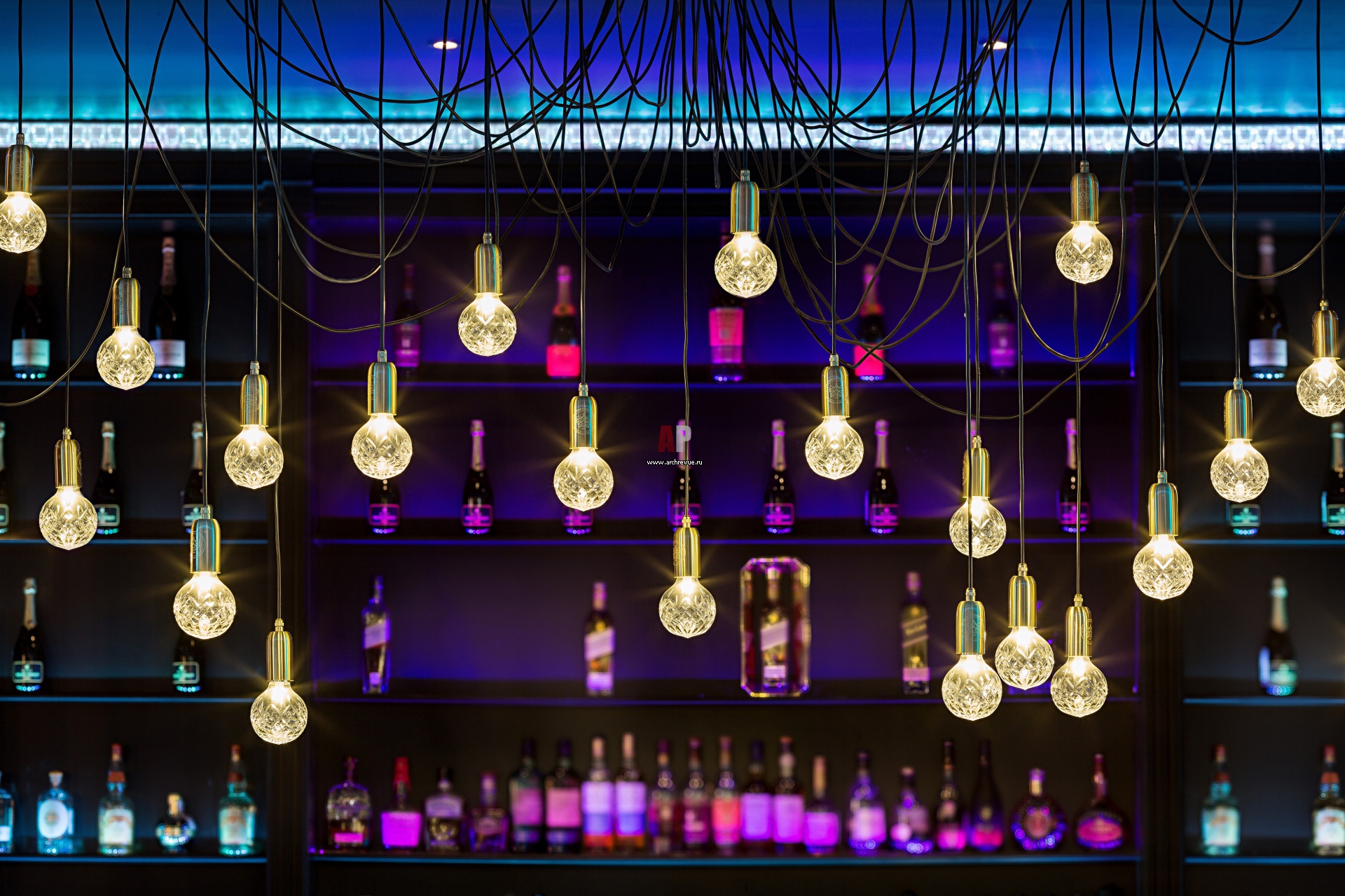 Фрагмент декора бара. Хрустальные светильники фабрики Lee Broom в зоне бара над столом-корягой.