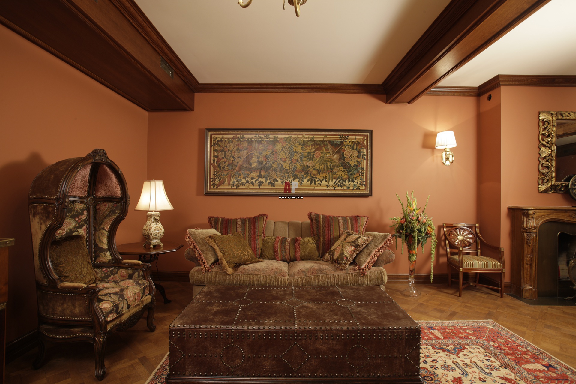 Зона отдыха в колониальном стиле при бильярдной. На полу – старинный паркет, обработанный маслом. Журнальный стол в виде кожаного сундука, Lexington. Персидский ковер ручной работы.