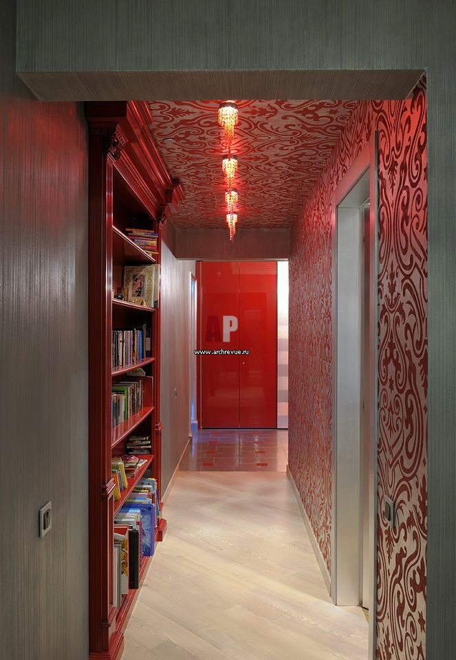 Интерьер квартиры решен в серебристо-серой цветовой гамме. Но в каждом помещении добавляется свой контрастный цвет, в коридоре – это бруснично-красный.