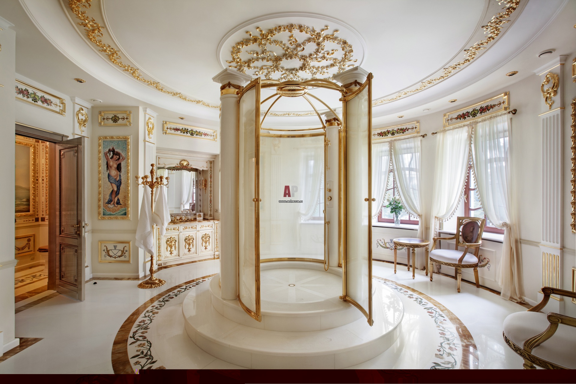 Интерьер белой ванной комнаты в овальном помещении, по центру на подиуме сделана душевая кабина с колоннами и золотой фурнитурой. Стены отделаны мозаичными панно из смальты и лепным декором с позолотой. Мраморный пол украшен растительным декором, выполненным в технике флорентийской мозаики.