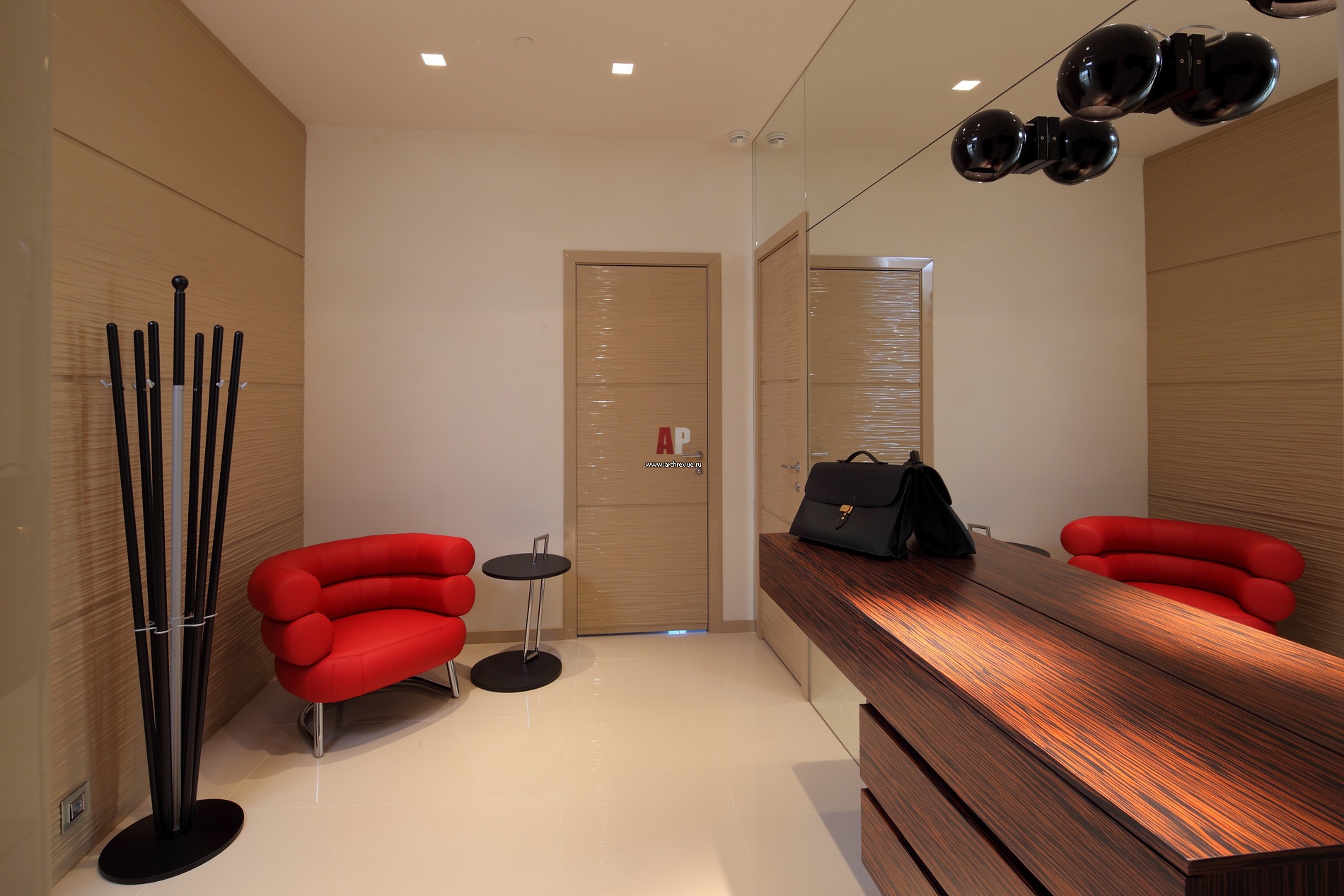 На полу входной зоны – глянцевый крупноформатный керамогранит Revigres. Кресло, столик Alivar, вешалка Porada.