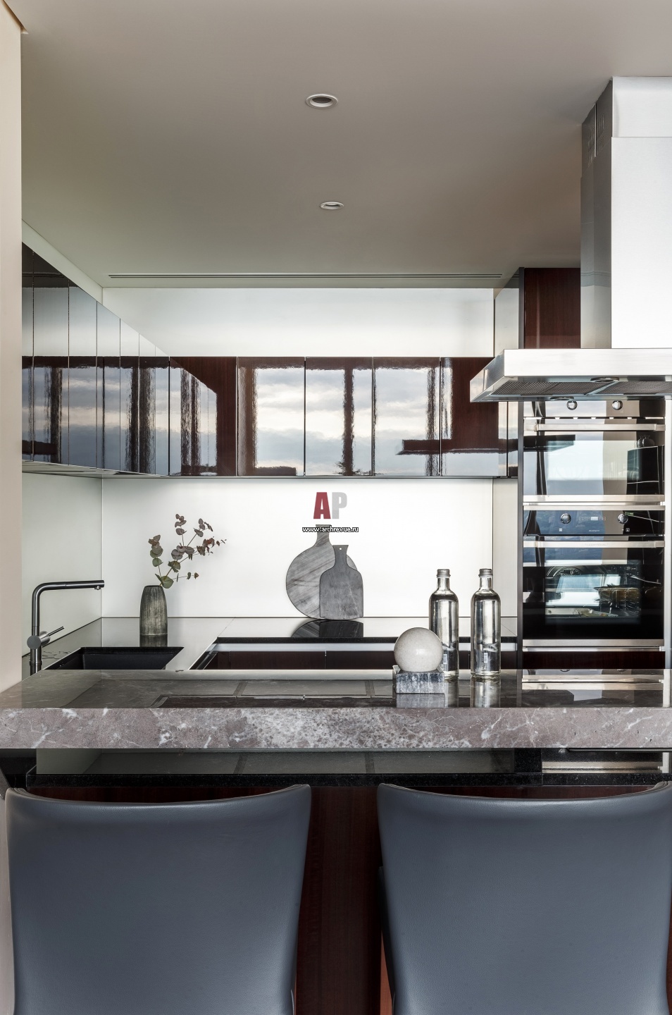 Квартира задумывалась как место для временных остановок, отдыха вдвоем и вечеринок с друзьями. Поэтому большую часть в ней занимает общая гостиная с кухней и сервировочной «а-ля фуршет» зоной.