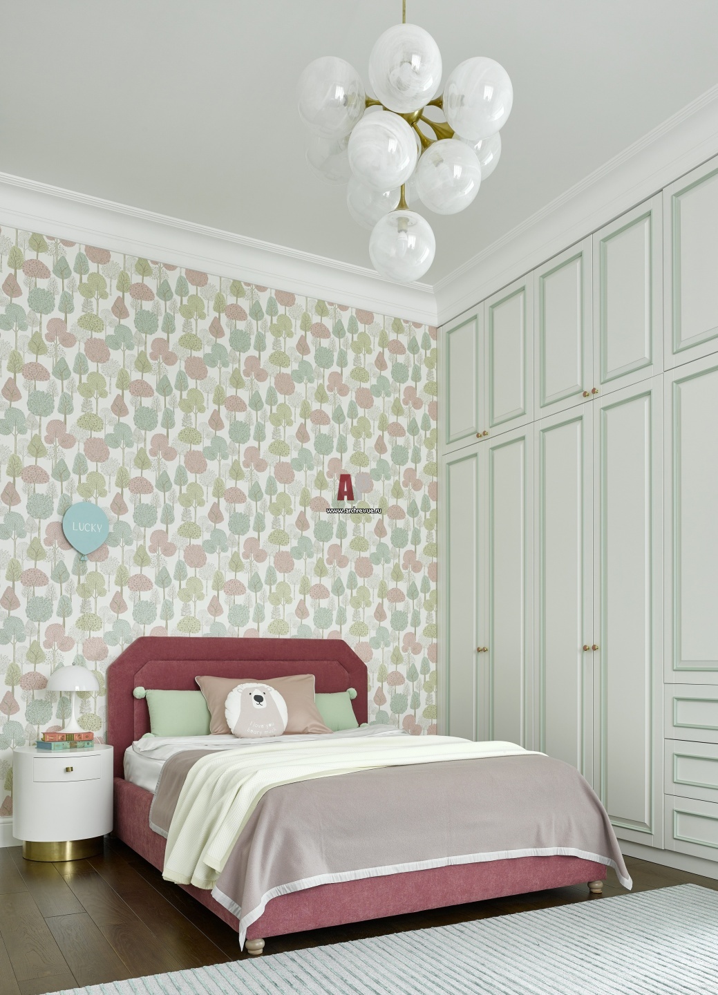 Спальня дочери оформлена в нежной пастельной палитре. Стена за кроватью декорирована бумажными обоями. Особенность архитектуры дома – высокие потолки.