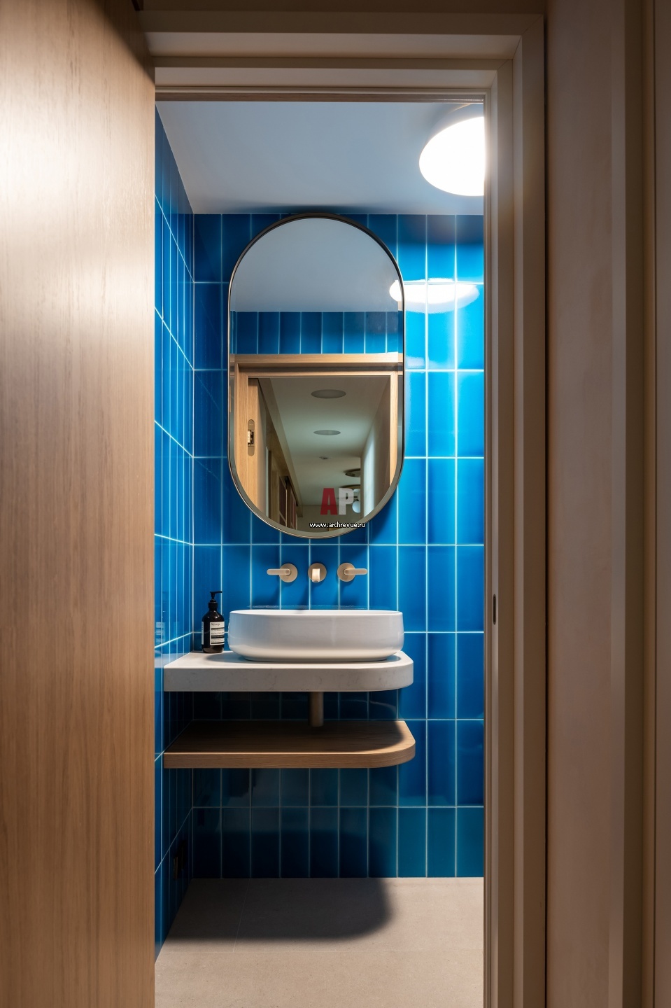 Гостевой санузел оформлен плиткой насыщенного синего цвета. Двери, мебель – из дуба.