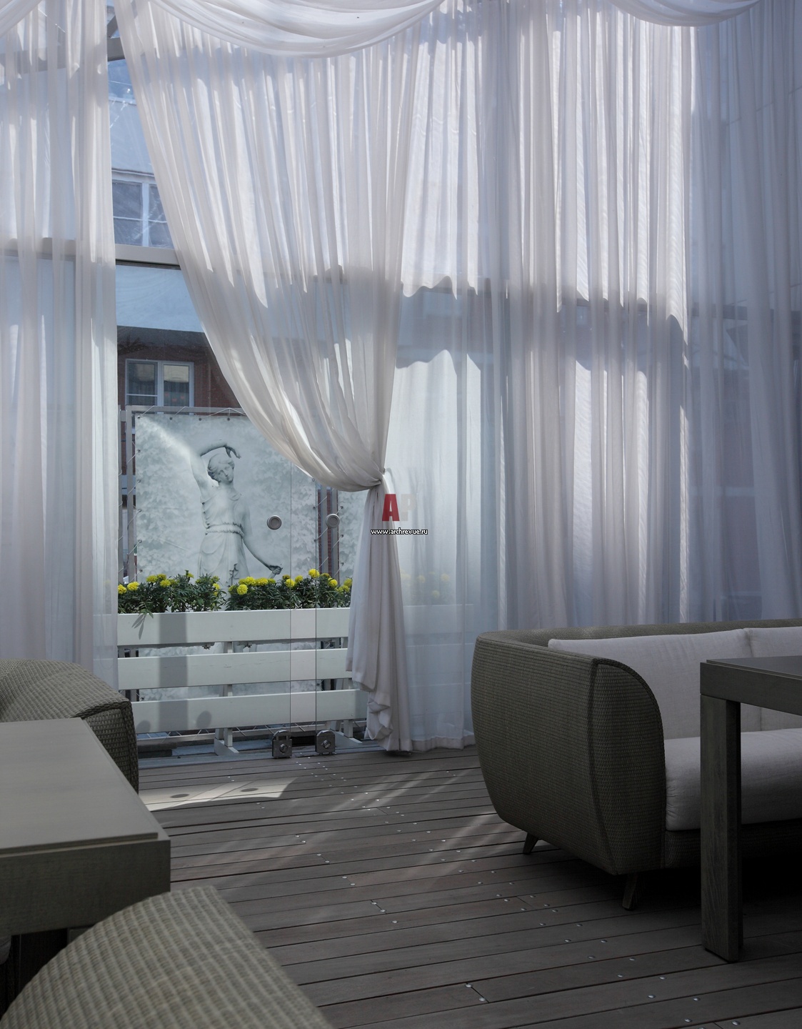 Чтобы шторы не раздувало ветром, в нижнюю часть полотен вшиты металлические грузики. Они не дают легкой ткани подниматься.